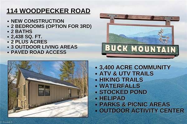 NEW CONSTRUCTION IN BUCK MOUNTAIN on 2+ acres thoughtfully designed w/open floor plan featuring a seamless blend of kitchen/dining/living, under cathedral ceilings, anchored by a fireplace. Eat-at bar provides extra seating. MAIN LEVEL LIVING w/2 bedrooms, full bath & laundry on main. Lower level offers endless possibilities. W/ambiance of the fireplace, this would be a great space for game/media room. 3-bedroom septic opens option for private bedroom suite to be added. Outdoor living w/covered porch, covered patio & spot to add fire pit. Built w/energy-efficient Superior Walls. Easily year-round paved road access. Ideal spot for weekend retreat or primary residence. Centrally located 30 min from Boone, West Jefferson & Wilkesboro. TRAVEL TIMES:Winston-1HR, Charlotte-1HR,40MIN, Raleigh-3HRS. Long & short-term rentals allowed. Buck Mtn Amenities: ATV/UTV & Hiking Trails, Parks, Fishing Pond, Waterfalls, Pavilions, Community Ctr & Outdoor Activity Ctr. Fiber optic available. VIRTUAL TOUR