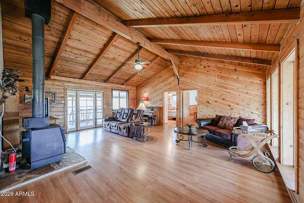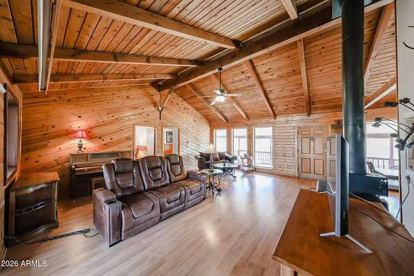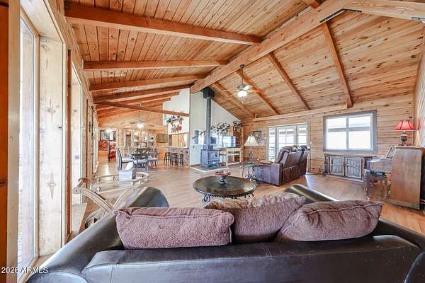 Welcome to this magnificent peaceful place you can make your home. Take in amazing views all around you with a sprawling landscape of trees and mountains, a huge front yard with a large deck in front, as well as off the back. Step inside to soaring vaulted ceilings with wood giving immediate calmness. To the right is the great room with large windows overlooking the property, plenty of space for entertaining or quiet night with a wood burning stove, and access to the backyard as well. To the left is a dining area, with seating off the kitchen peninsula, with lots of cabinetry, appliances, and spacious walk in pantry. The primary bedroom is a little farther to the left with a private bathroom. Beyond the kitchen is your laundry space, and a newer half bath. Then, not included in the square footage is two additional spaces for an office, workout room, or whatever you need! On the opposite side of the home are two more bedrooms with closets. Step outside to check out the covered barn area, with an insulated workshop on its own concrete pad, locked area for storage, and two open areas for toys, animals, or whatever you need. There's also a well with 5000 gallon storage capacity (dual tank), and pump shed on the property with soft water loop available. The rainwater collection system has a 500 gallon container, as well as another 1000 gallons. Septic was pumped in recently in 2024/2025. There is also a gazebo with window walls to enjoy the outdoors, and an RV that sleeps 6 on the property as well. There's a car port with solar panels that ties into the grid for lower electric bills. Another shaded structure for toys or tractors sits next to the barn area. The home has a new roof and is ready for it's new owners! There's a screened house on the acreage behind the home (sold in conjunction with this home with 4.719 acres at 50K MLS #6992277).