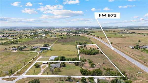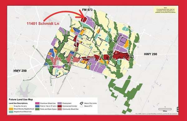 Positioned at the high-visibility intersection of FM 973 and Schmidt Lane, this 5.25-acre property offers exceptional opportunity in one of the fastest-growing corridors in Central Texas. With over 800 feet of frontage along FM 973 and 517 feet of frontage on Schmidt Lane, the property provides maximum exposure and accessibility. Located within the Manor ETJ and designated as a "Commercial Corridor" in the City of Manor's future land use plan, the tract is ideally suited for large-scale commercial development including big box retailers or multi-tenant commercial uses. The land is level, buildable, outside the floodplain, and features no restrictions. Aqua Water supply is available, and the property also includes a 1,500 sq ft home and well-maintained outbuildings that provide rental income potential while you plan future development. Just 12 minutes south of Samsung's new semiconductor facility and 24 minutes north of Tesla's Gigafactory, this rare small-acreage tract on FM 973 offers endless investment and commercial possibilities.