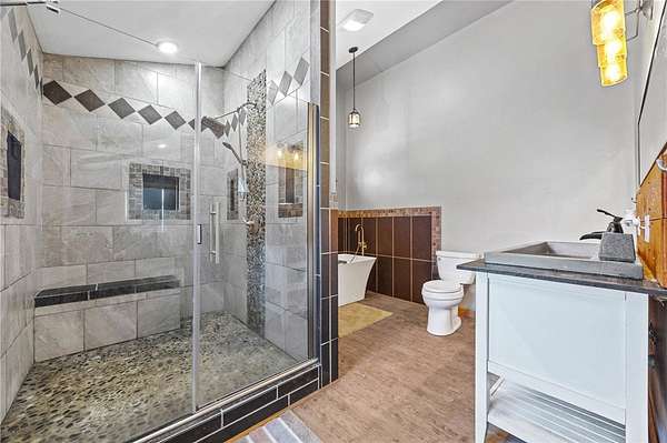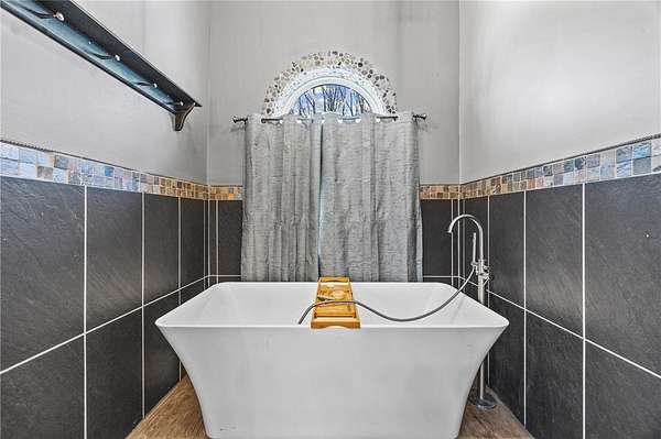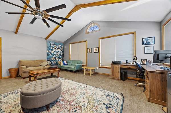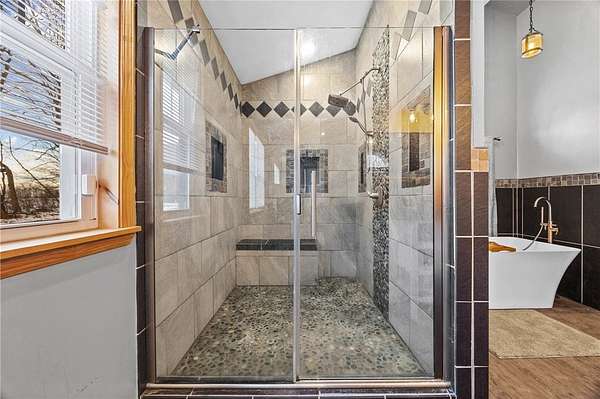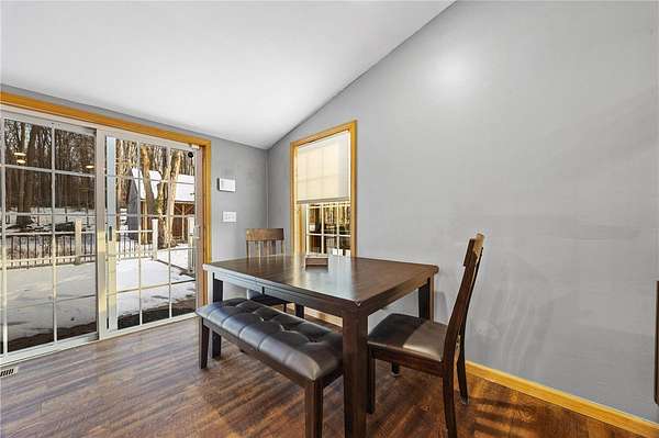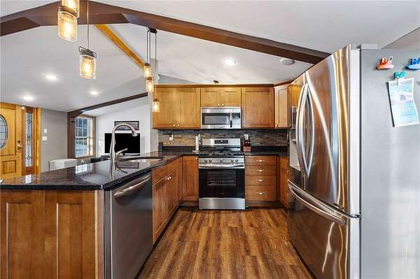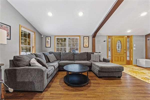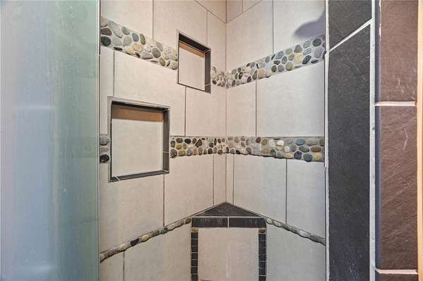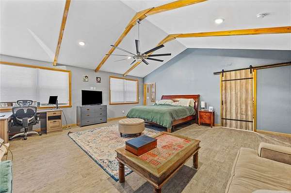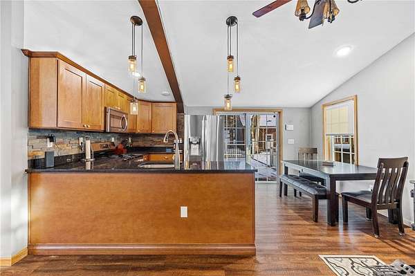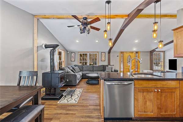 - Bath In Primary Bedroom, Cathedral Ceilings, Ceiling Fans, Eat In Kitchen, Granite Counters, Kitchen Family Room Combo, Main Level Primary, Natural Woodwork, Primary Suite, Skylights, Sliding Glass Doors