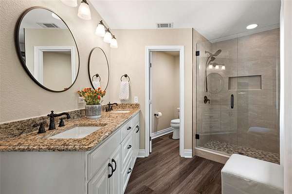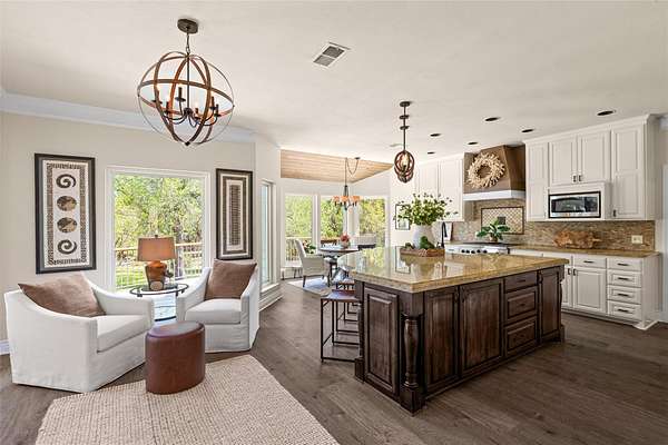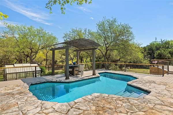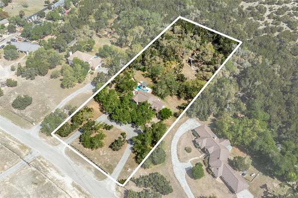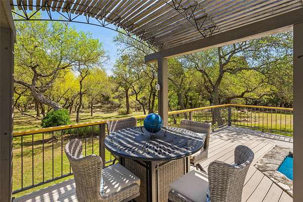Tucked into the peaceful acreage of Oak Run West, this 1.635-acre ranchette serves up space, updates, and just the right amount of Hill Country charm. With a wet weather creek weaving through the back of the property and multiple outdoor living areas, this is where quiet mornings meet lively evenings. The in-ground pool, greenhouse, raised garden beds, and expansive entertaining spaces create a backyard that feels more like a private retreat than a residence. A 2,500-gallon water storage tank, water system, and LCRA water access add both practicality and peace of mind, while recent exterior paint and an epoxied garage floor keep everything looking sharp. Inside, the 3,158 sq ft two-story layout delivers flexibility and function with four bedrooms and 3.5 baths, including dual primary suites both upstairs and down. The open kitchen flows seamlessly into the living area, anchored by a large island with abundant storage, a walk-in pantry with built-in desk and laundry, and a breakfast nook featuring a natural wood slate ceiling that brings warmth and character. Natural light pours in through updated Andersen windows (2024), highlighting fresh interior paint (2026), built-in bookcases, and thoughtfully designed storage. Upgrades include a new HVAC (2023), tankless water heater in the primary (2026), and a new whole-home water heater (2026), new patio railing (2026). Secondary bedrooms are generously sized, with one offering the potential to convert into two separate rooms if needed. Located just minutes from HEB, restaurants, and medical facilities, this property balances privacy with convenience. A rare blend of acreage, updates, and livable luxury. This one is ready to work hard during the week and entertain like a pro on the weekends.