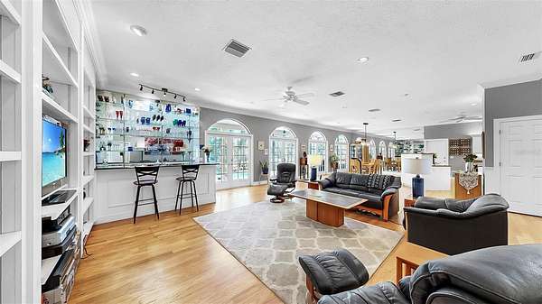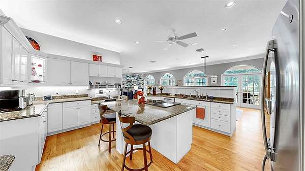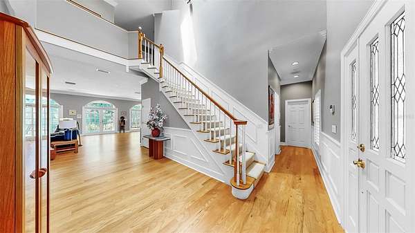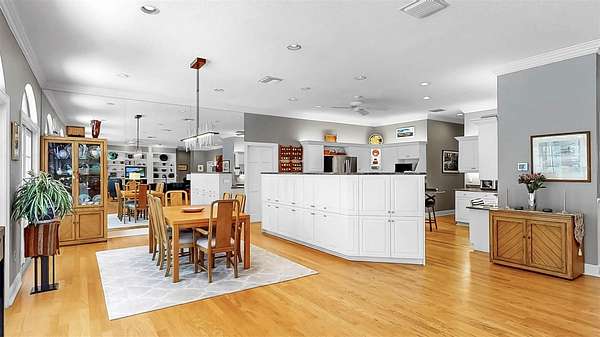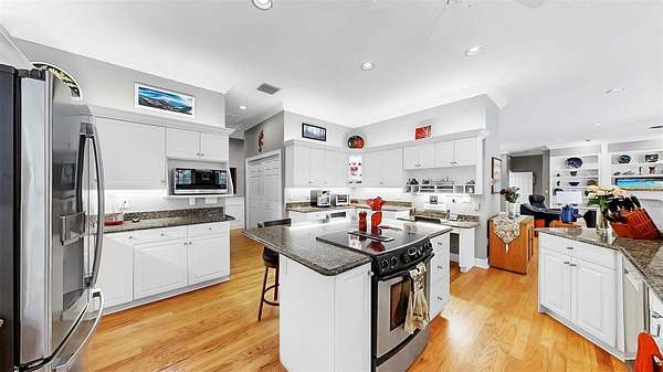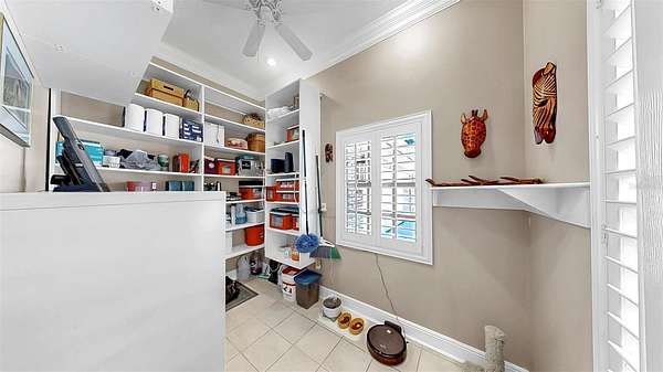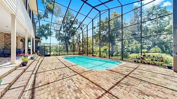 Step through the charming covered front porch into a grand entryway with crown moulding, elegant wainscoting, and rich hardwood floors. Throughout the home, you'll find thoughtful details such as plantation shutters, marble window sills, built-in shelving, and abundant storage, including a temperature-controlled attic storage room. The gourmet kitchen is a chef's dream, boasting two islands--one with a cooktop, the other with added storage--stone countertops, an expansive walk-in pantry, and seamless flow into the main living areas. Entertain effortlessly with a dry bar in the living room and a wall of French doors that open to a breathtaking two-story screened lanai featuring a resort-style pool with 10-foot depth.