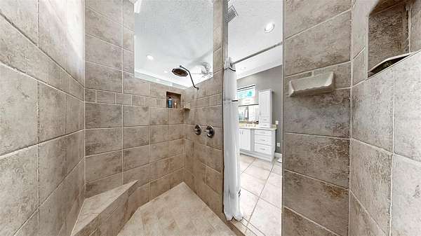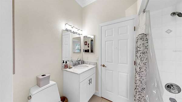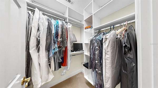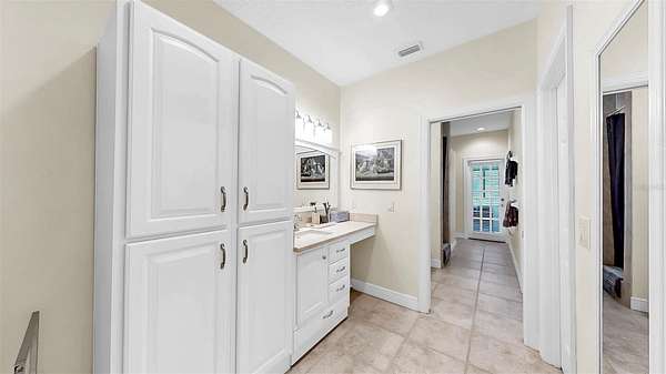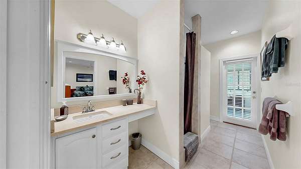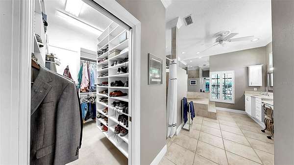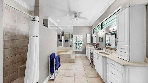 The luxurious primary suite is a private retreat with direct lanai access, a spa-inspired bath with double walk-in shower, jetted tub, marble countertops, and a stunning stained-glass window. A custom walk-in closet conveniently connects to the laundry room, offering both elegance and everyday functionality. Additional accommodations include a first-floor guest suite with ensuite bath and walk-in closet, an upstairs bedroom with dual walk-in closets and ensuite bath, and a versatile flex room with panoramic views--ideal for a home office, gym, or studio.