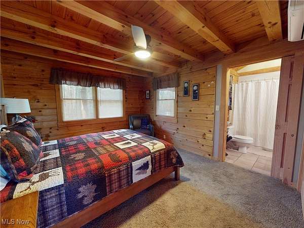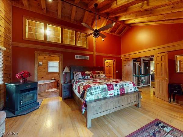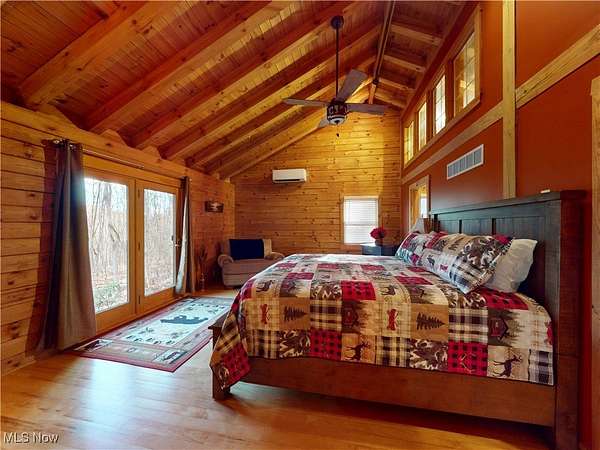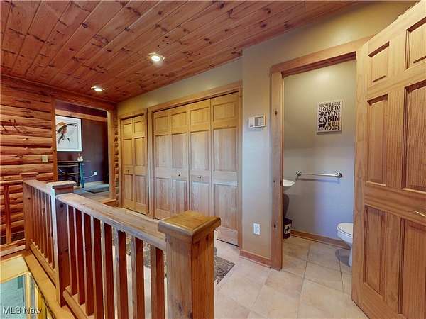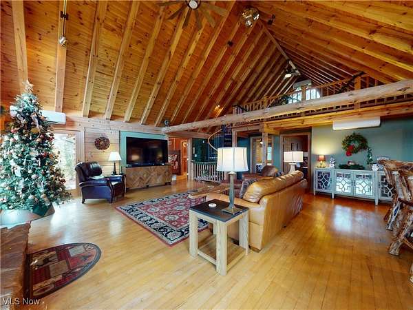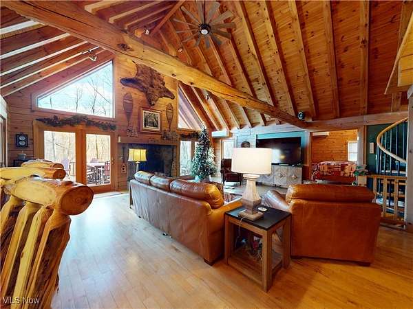 Stunning 5-bedroom log cabin on 17.60 acres, featuring 4 full bathrooms, 1 half bath, and a 3-car attached garage with heated floor. Whether you're looking for a forever home or a strong investment opportunity, this property delivers. The home borders the Grand River, offering picturesque views throughout. The main level features a living room with vaulted wood-beamed ceilings, a converted wood-burning fireplace, and sliding doors that open to the large deck. Spiral stairs lead to a loft with its own balcony. The kitchen-open to the living room-offers a professional stove, wine fridge, and abundant cabinetry. The main-level primary suite includes a pellet stove, walk-in cedar closet, and a luxury ensuite. Two additional main-floor bedrooms are included, one with an ensuite that also connects to the living area. A separate dining room, large pantry, and laundry room complete the first floor. The lower level adds exceptional living and entertainment space, including two bedrooms (one with a separate sitting area), a recreation room with a bar and full kitchen, a wine cellar, an office, a soundproof DJ booth, a dog wash station, a wood-burning stove, and walk-out access to a wet bar and hot tub overlooking the river. Outdoor amenities include multiple patios (one with new stairs), a large front porch, a pond, a 1-car detached garage, and an oversized outbuilding of over 3,500 sq. ft. with a workshop, storage garage, bathroom, and an upper-level living area. The newly paved driveway includes a full security system. The home has been recently stained and fully weatherproofed, and the river view has been professionally cleared. Major recent upgrades include a new boiler, tankless water heater, leaf-guard gutters, nine Fujitsu air/heat split units, and a relined and cleaned fireplace. Too many updates to list-ask your Realtor for the full update list and the drone tour video.
