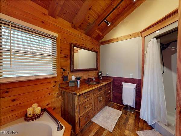 - Bar, Beamed Ceilings, Breakfast Bar, Cathedral Ceilings, Eat In Kitchen, Entrance Foyer, High Ceilings, In Law Floorplan, Kitchen Island, Natural Woodwork, Open Floorplan, Pantry, Primary Downstairs, Recessed Lighting, Smart Thermostat, Soaking Tub, Track Lighting, Vaulted Ceilings, Walk In Closets, Wet Bar