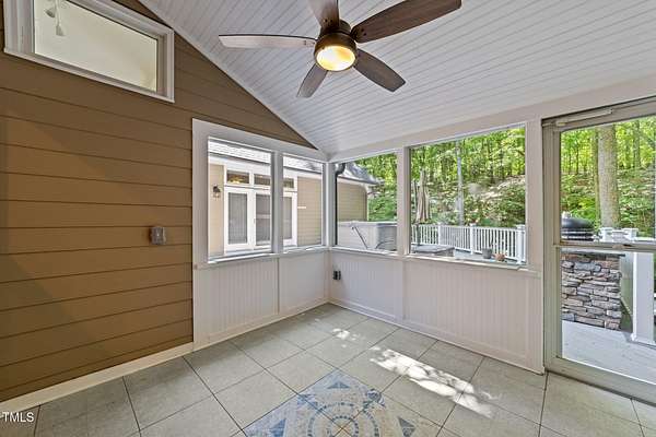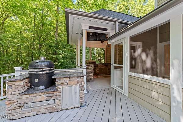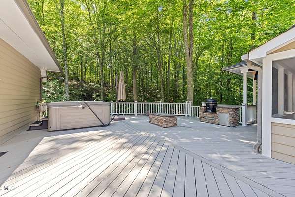 Welcome to 11425 Blackhorse Run - a private wooded retreat on 1.5 acres with over 4,300 square feet, 4-bedrooms, 5-baths, a first floor master, and a 2-car garage. This friendly community offers horse stables, riding trails, a community pool, and a clubhouse! The first-floor owner's suite features a private alcove entry, crown molding, chair-rail, plush carpet, and double glass doors with transoms that lead to the back deck. The ensuite bath is bright and spacious with a skylight, dual vanities, large tile floors, whirlpool tub, separate shower with tile surround, and wooded views above the tub. The walk-in closet features custom California-style built-ins. The kitchen is a dream: crisp white cabinetry, granite countertops, tile backsplash, recessed lighting, and crown molding throughout. There's an eat-in breakfast area with a breakfast bar, and wet bar with storage, plus direct access to the screened porch-ideal for indoor/outdoor living. Just off the kitchen, a sunroom with a fireplace and built-in cabinetry offers a cozy place to unwind. The family room features a stacked-stone fireplace to the ceiling, framed by custom built-in cabinets and trim detailing. Welcoming 2-story foyer with hardwood floors, flanked by a formal dining room featuring crown molding, chair rail, and a large bay window. Upstairs, you'll find three additional spacious bedrooms, two full bathrooms, and a unique flex sunroom overlooking the wooded backyard-perfect as a reading room or yoga space. The lower level includes a large rec room, game room, workshop, a full bath, and access to the oversized 2-car garage. Out back, the outdoor living space shines with a sprawling deck, built-in grill station, Kamado-style ceramic cooker, covered outdoor kitchen with granite countertops and sink, and a hot tub for year-round enjoyment. Enjoy serene views of the mature hardwood forest, stone paths, garden beds, a fenced vegetable garden, and a charming footbridge over a natural creek. This home offers the space and serenity you've been looking for. Make an appointment for a private tour today!