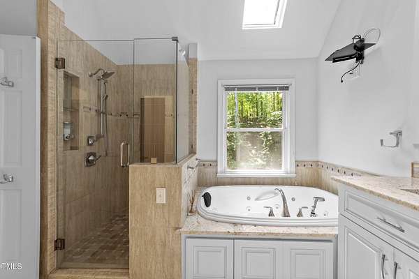 - Bathtub/Shower Combination, Bookcases, Breakfast Bar, Cathedral Ceiling(s), Ceiling Fan(s), Chandelier, Crown Molding, Double Vanity, Dual Closets, Eat-In Kitchen, Entrance Foyer, High Ceilings, Kitchen Island, Primary Downstairs, Quartz Counters, Recessed Lighting, Separate Shower, Smart Thermostat, Smooth Ceilings, Walk-In Closet(s), Walk-In Shower, Water Closet, Wet Bar, Whirlpool Tub, Wired For Sound