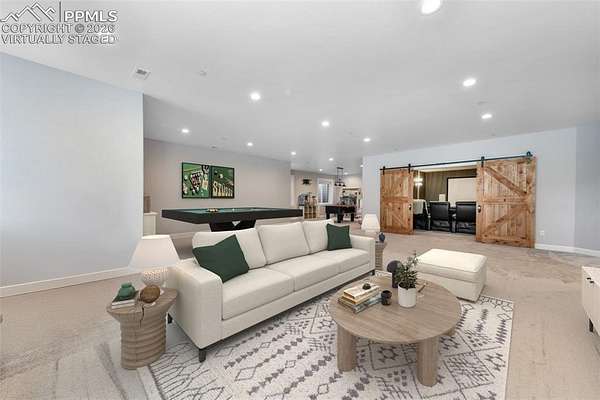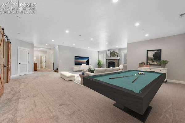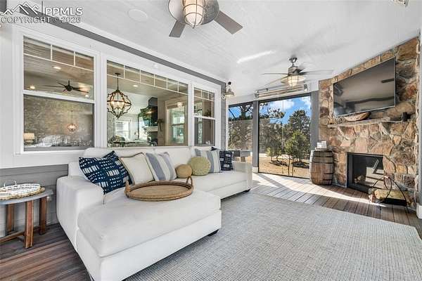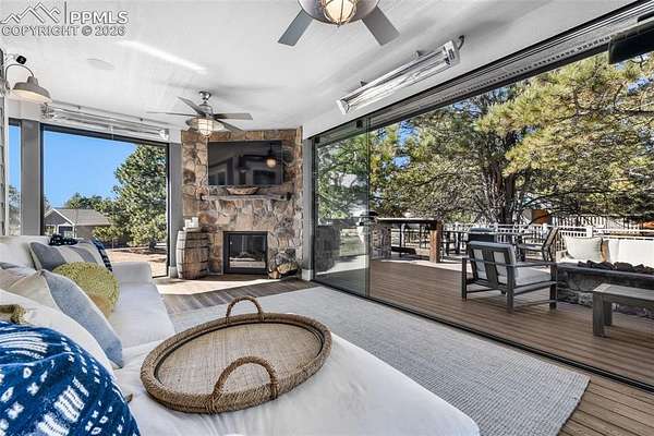 From the moment you arrive, this remarkable home welcomes you with towering trees, a sense of privacy, and a charming front porch that sets the tone for what lies within. Step inside and enjoy a stunning sightline straight through to the back of the home, immediately highlighting the quiet, peaceful setting that defines this retreat. The main level is both elegant and functional, beginning with a light-filled office that can easily transition into a bedroom if needed. A beautifully finished full bathroom and a spacious secondary bedroom with a walk-in closet offer comfort and flexibility for guests or family. The heart of the home unfolds into a bright, open-concept living, dining, and kitchen area designed for effortless entertaining. Large windows flood the space with natural light, while the gourmet kitchen impresses with tall cabinetry, an expansive island perfect for gathering, and a generous pantry. The living room features vaulted ceilings, a striking fireplace, and custom built-in shelving, creating a warm yet refined atmosphere. A cozy, tucked-away dining area adds an intimate touch. The private primary suite is a true sanctuary, offering serene views of the surrounding trees, direct access to a private deck, and a spa-like bathroom with a soaking tub, double vanity, walk-in shower, and large walk-in closet. A spacious mudroom and well-appointed laundry room with ample storage complete the main level. The indoor-outdoor living spaces are nothing short of extraordinary. The enclosed patio, wrapped in glass doors and windows, allows year-round enjoyment with a fireplace, heaters, music, and even a game space. Outside, the deck features a fire pit, grill area, refrigerator, and speakers. Below, a private hot tub area and an additional patio with another fire pit and fountain create the perfect setting for relaxation. The basement offers exceptional versatility with recreation spaces, a theater room, two large bedrooms with walk-in closets, and a full bathroom.