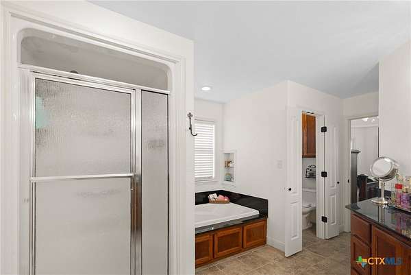 - Breakfast Area, Breakfast Bar, Ceiling Fans, Dining Area, Double Vanity, Eat In Kitchen, Garden Tub Roman Tub, Granite Counters, Home Office, Kitchen Island, Main Level Primary, Pantry, Primary Downstairs, Pull Down Attic Stairs, Separate Formal Dining Room, Separate Shower, Soaking Tub, Tray Ceilings, Upper Level Primary, Walk In Closets, Walk In Pantry