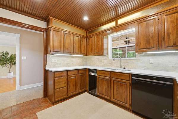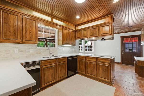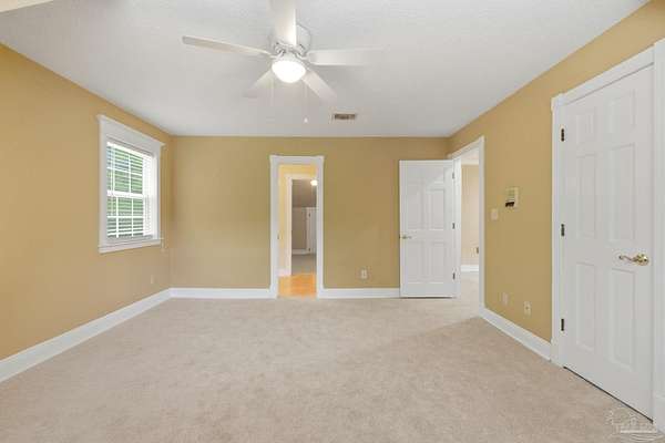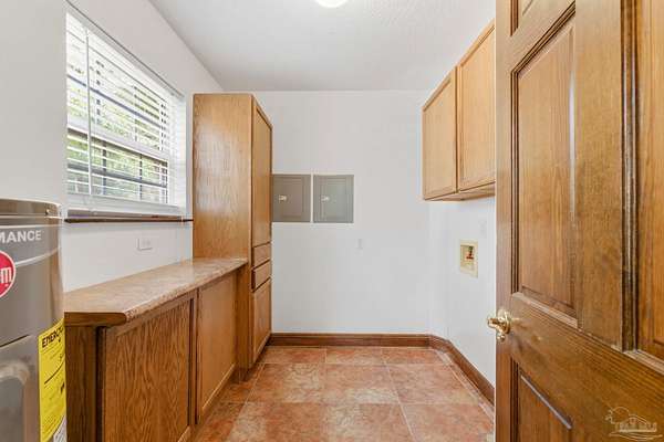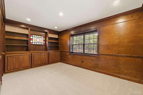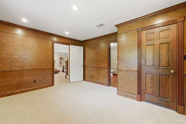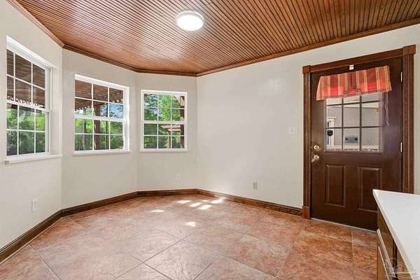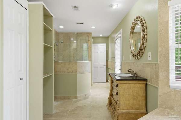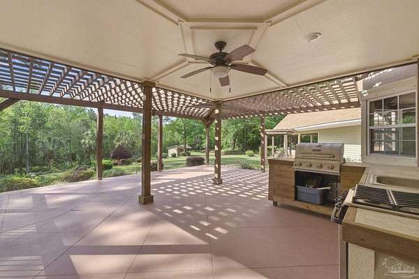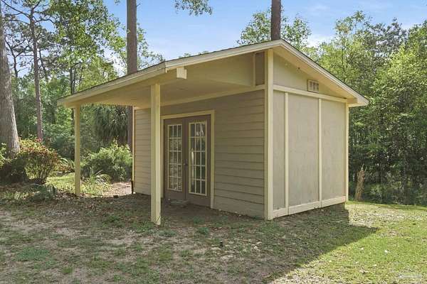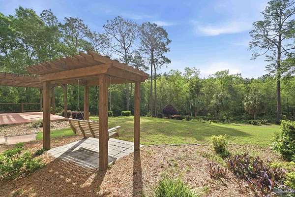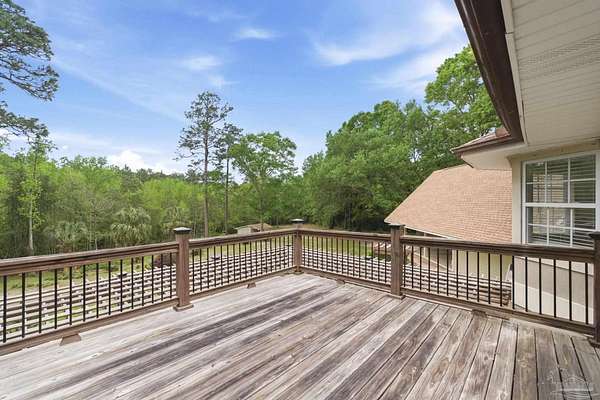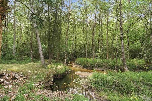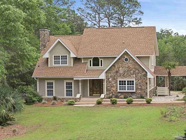 Unbelievable beauty paired with functional space! This two story home offers both. Drive through the stone gate, up the winding driveway to this custom built, one-owner home with large detached garage. Perfectly placed on 1.77 acres of rolling hills with room for an RV with electric hookup and nestled within the quiet neighborhood of Clear Creek Farms, this gorgeous 5-bedroom residence offers a rare blend of natural tranquility and peaceful sophistication. Spanning over 3,700 square feet of meticulously cared for space, the home features a backyard flowing creek and mature landscaping that create an immediate sense of sanctuary. Hike through your own backyard to the nearby UWF walking trails! Come inside and see the many useful spaces with renovations and updates. 2023 roof, 2024 hot water heaters, brand-new flooring across the main and upper levels, updated designer ceiling fans, and a kitchen featuring beautiful new quartz countertops paired with a stylish tile backsplash. The architectural layout prioritizes versatility, highlighted by a finished basement equipped with a second kitchen, private bedroom, and expansive bonus area ideal for multigenerational living, a guest area, or mother-in law suite. On the main level, a formal dining room and cozy living area are complemented by flexspace for a first floor bedroom or home office featuring custom built-in shelving and an attached full bath. The primary suite serves as a retreat, boasting three closets, dual vanities, and a large balcony overlooking your private grounds. Valuable exterior amenities include a detached two-car garage with attic storage or workshop, a two-car carport, and a powered outbuilding for extra storage. Hurricane protection devices, sprinkler, and lawn water pump are just a few more bonuses. Peaceful living that is still close to restaurants and shopping. Yes, you can have the best of both worlds. A warm home with acreage and a convenient location. Call for a tour today!
