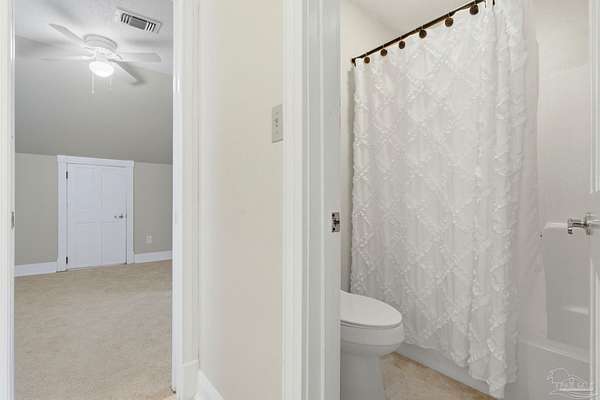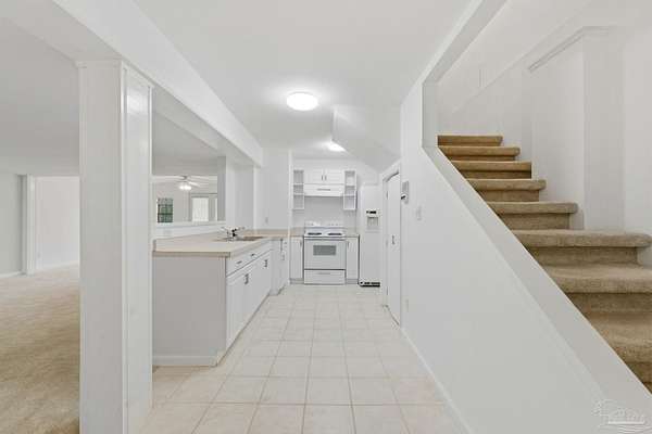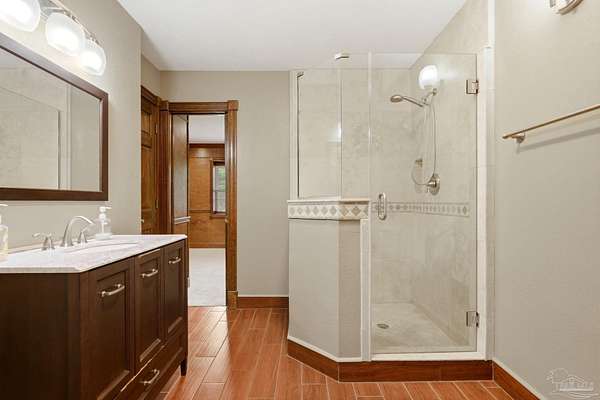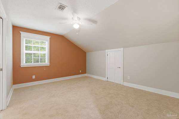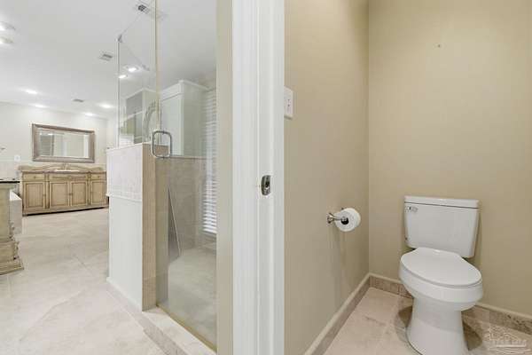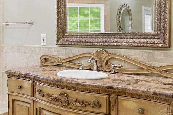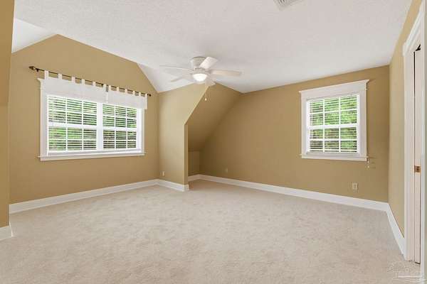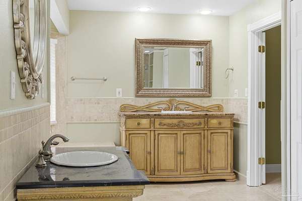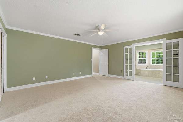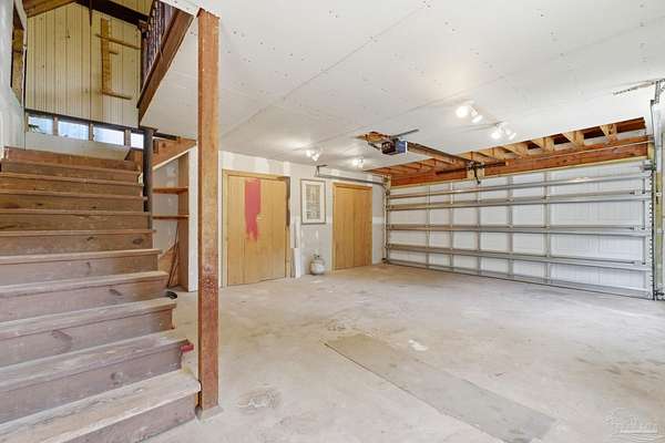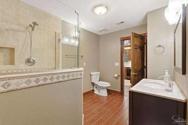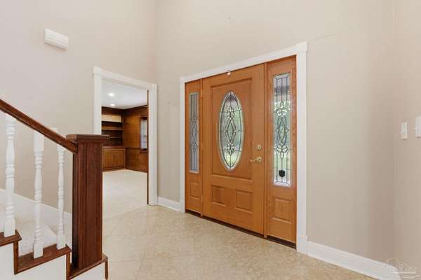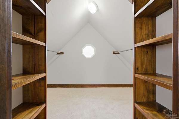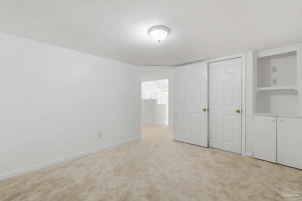 Unbelievable beauty paired with functional space! This two story home offers both. Drive through the stone gate, up the winding driveway to this custom built, one-owner home with large detached garage. Perfectly placed on 1.77 acres of rolling hills with room for an RV with electric hookup and nestled within the quiet neighborhood of Clear Creek Farms, this gorgeous 5-bedroom residence offers a rare blend of natural tranquility and peaceful sophistication. Spanning over 3,700 square feet of meticulously cared for space, the home features a backyard flowing creek and mature landscaping that create an immediate sense of sanctuary. Hike through your own backyard to the nearby UWF walking trails! Come inside and see the many useful spaces with renovations and updates. 2023 roof, 2024 hot water heaters, brand-new flooring across the main and upper levels, updated designer ceiling fans, and a kitchen featuring beautiful new quartz countertops paired with a stylish tile backsplash. The architectural layout prioritizes versatility, highlighted by a finished basement equipped with a second kitchen, private bedroom, and expansive bonus area ideal for multigenerational living, a guest area, or mother-in law suite. On the main level, a formal dining room and cozy living area are complemented by flexspace for a first floor bedroom or home office featuring custom built-in shelving and an attached full bath. The primary suite serves as a retreat, boasting three closets, dual vanities, and a large balcony overlooking your private grounds. Valuable exterior amenities include a detached two-car garage with attic storage or workshop, a two-car carport, and a powered outbuilding for extra storage. Hurricane protection devices, sprinkler, and lawn water pump are just a few more bonuses. Peaceful living that is still close to restaurants and shopping. Yes, you can have the best of both worlds. A warm home with acreage and a convenient location. Call for a tour today!