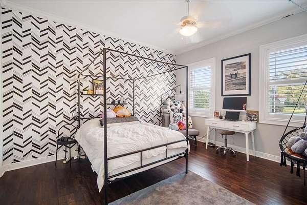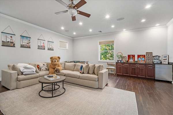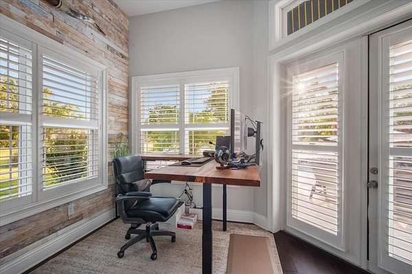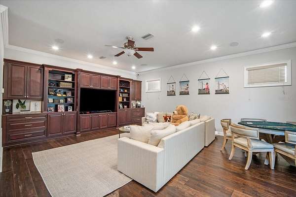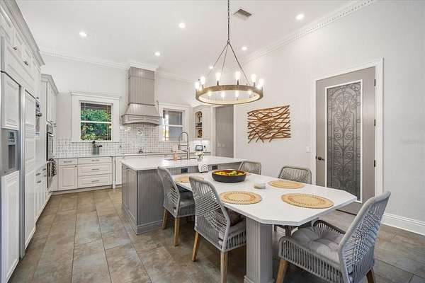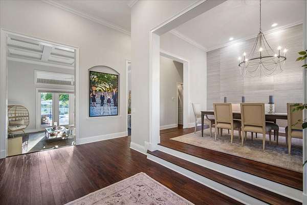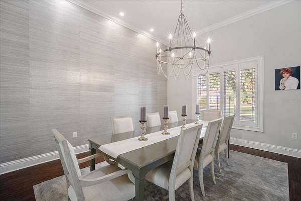 Step through the doors into a thoughtfully designed layout that blends openness with function. The spacious great room is filled with natural light from oversized windows that frame stunning views of the pool and outdoor living areas. Crown molding, refined finishes, and rich new flooring throughout create a cohesive and elevated feel. The formal dining room offers the perfect setting for holiday gatherings and elegant dinner parties.