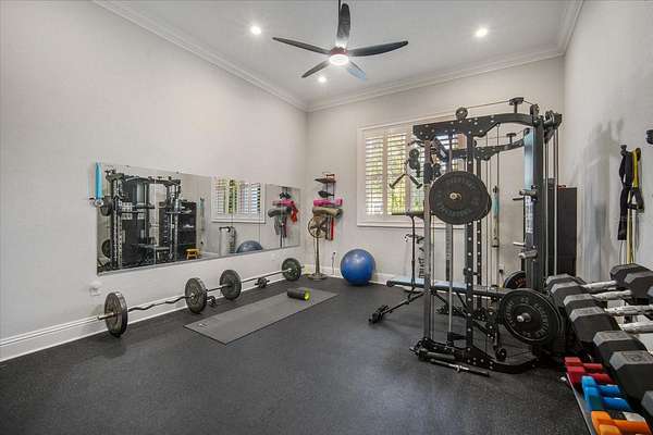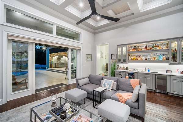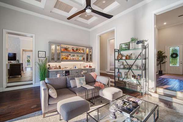 - Built-In Features, Ceiling Fans(s), Coffered Ceiling(s), Crown Molding, Dry Bar, Eat-In Kitchen, Primary Bedroom Main Floor, Solid Wood Cabinets, Split Bedroom, Stone Counters, Walk-In Closet(s), Wet Bar