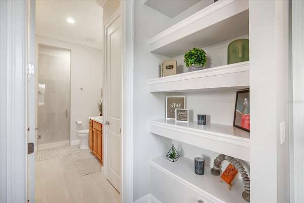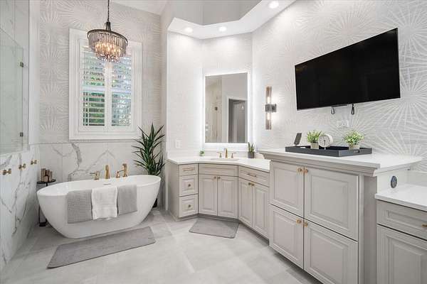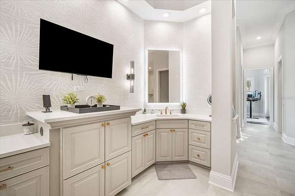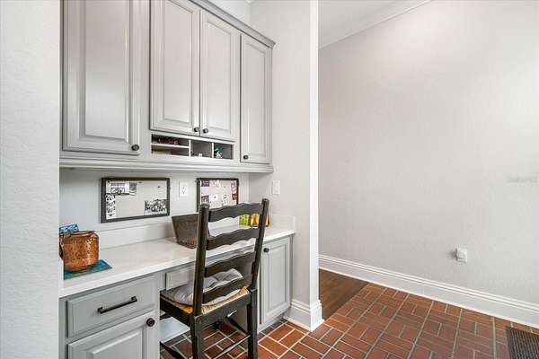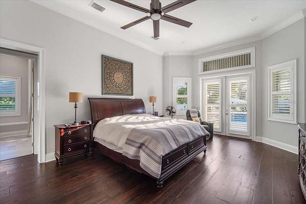 All five bedrooms are conveniently located on the main floor, each generously sized and thoughtfully positioned. Four bedrooms feature private en-suite baths, creating ideal accommodations for multigenerational living or extended guests. The primary suite is a private retreat with serene pool views, direct lanai access, and a luxurious en-suite bath featuring dual vanities, a soaking tub, a spacious walk-in shower, and two walk-in closets. Just off the primary suite, a dedicated home office with pool views.