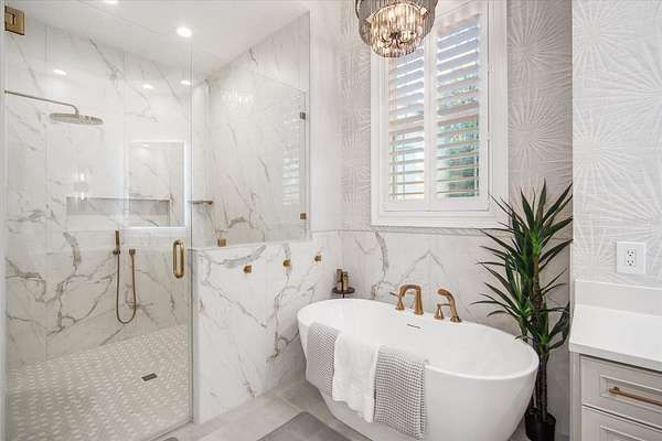 Additional practical features include an oversized laundry room with extra cabinetry, epoxy flooring in the garage, a large storage area above the garage, a new HVAC system for the main house, a newer water heater, fresh paint, new flooring throughout, and beautifully renovated bathrooms and kitchen.