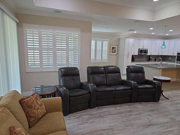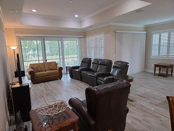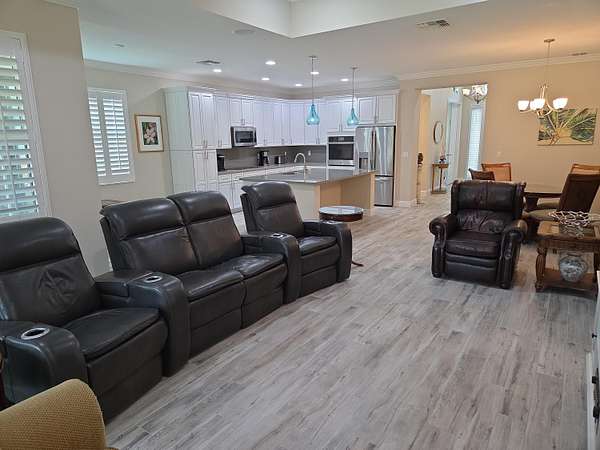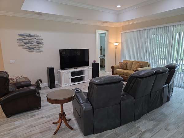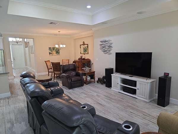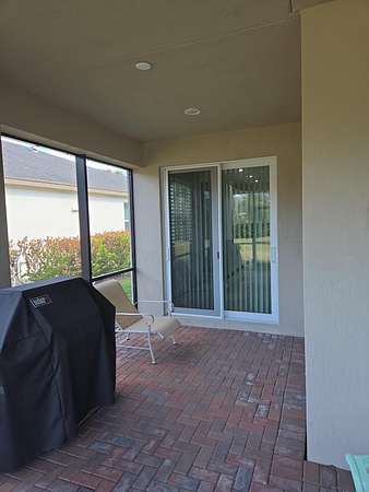 Upgraded Coastal Collection Admiral model single-family home in the desirable 55+ gated Lake Park at Tradition community! Built in 2019 by renowned Minto Builders, this 2BDR, 2.5BA, den/office, 2-car garage, and a screen-enclosed lanai-perfect for relaxed Florida living. Outstanding curb appeal with architectural front windows, tile roof with full gutters, impact-resistant doors/windows/sliding glass patio doors, and extended paver driveway. Step inside the tall foyer to luxurious porcelain tile flooring throughout, elegant crown molding, full baseboards, and recessed lighting in the great room, den, master bedroom, guest bedroom, kitchen, foyer, and garage. The open great room features a wall-mounted TV package with ceiling speakers for seamless entertainment. Custom white plantation shutters grace all windows, with verticals on the sliding glass doors. Gourmet kitchen boasts 42" upper cabinets with crown molding, a large center island with 4" under mount stainless steel sink, disposal, and dishwasher. Quartz countertops complement the GE Innovation Package stainless steel wall oven, microwave, built-in cooktop, and French door refrigerator. Convenient laundry room includes Whirlpool washer/dryer, utility sink, and upper cabinets. Enjoy low-maintenance living in this vibrant active adult community with resort-style amenities, nearby Tradition Town Center shopping/dining and easy access to beaches, golf, and healthcare. Don't miss this move-in-ready gem-schedule your private showing today!