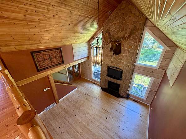 Escape to your own private haven with this stunning log home, perfectly nestled on 11 pristine acres along Hyde Lake in the sought-after Harper Creek school district. This turn-key retreat blends rustic charm with modern amenities, offering a serene country lifestyle just minutes from conveniences. Features a bright, open floor plan with a welcoming great room featuring vaulted ceilings and expansive windows to frame lake views. The kitchen has ample counter space and adjacent dining area designed for entertaining everyone. The generous primary suite with private bath and huge walk-in closet is located on the main floor. The walkout finished basement-perfect for a family room, recreation area, or guest suite, with direct access to the outdoors. Relax on the covered porch or stroll the manicured grounds; mature trees, lush landscaping, and serene lake ambiance..even go for a boat ride around the lake. There are two oversized pole barns ready for all your toys, equipment, and hobby farm needs; ideal for vehicles, ATVs, woodworking, or a dedicated workshop. Don't miss large cleared acreage suitable for small- to mid-scale farming, gardens, or pasture for livestock. You can even go hunting out your front door and fishing right out your back door. Do not miss out on this lovingly cared for, move-in ready home. Just bring your belongings and start living your best life home. Ideal for buyers seeking space, privacy, and a strong sense of place, this log home offers a rare blend of rustic charm and modern convenience. Don't miss your opportunity to own a turnkey lakefront lifestyle in Harper Creek schools. Call today to schedule your private tour. Realtor Dustin Damon