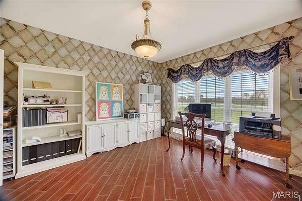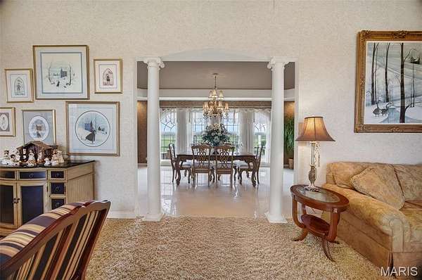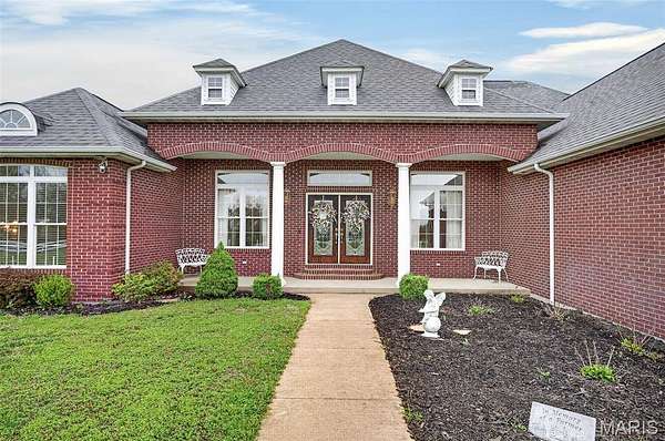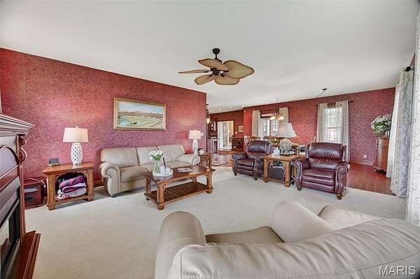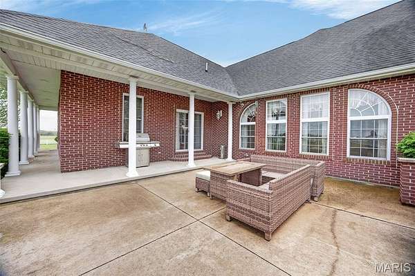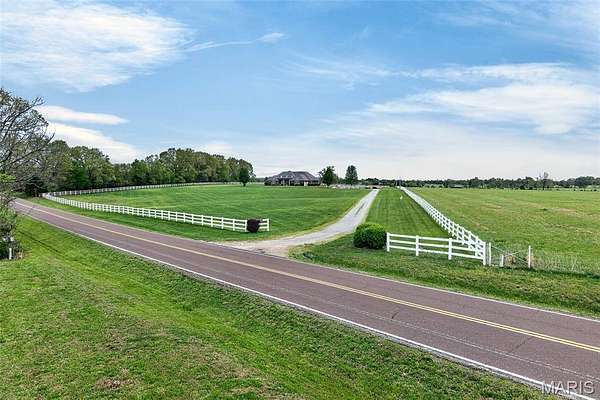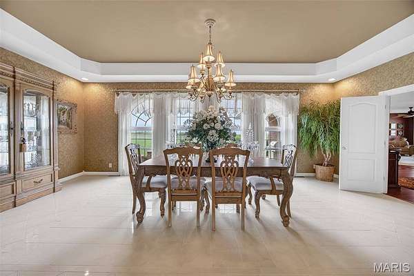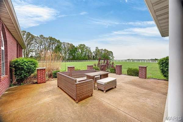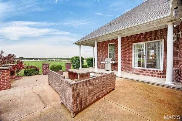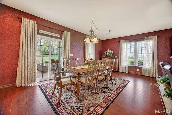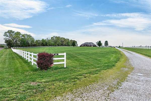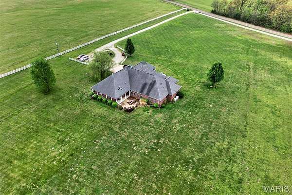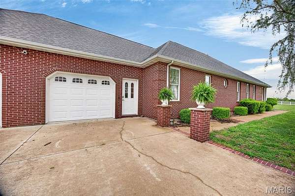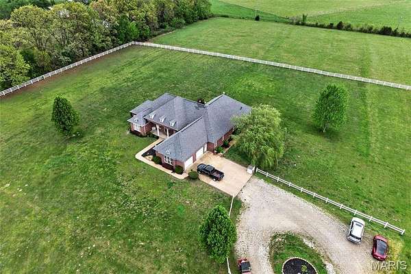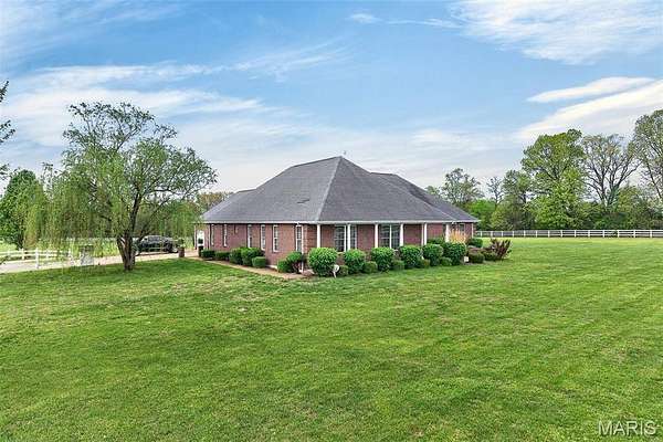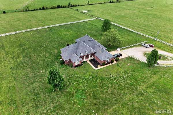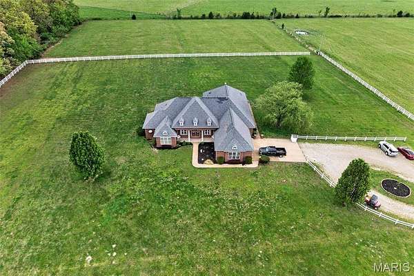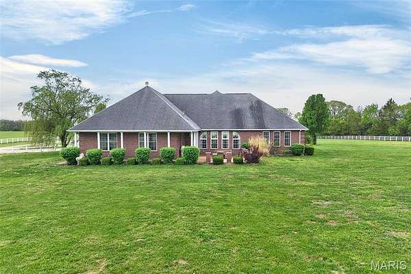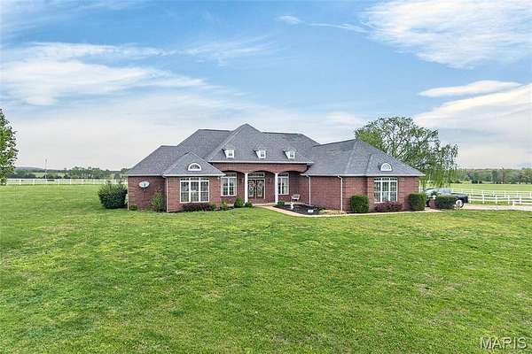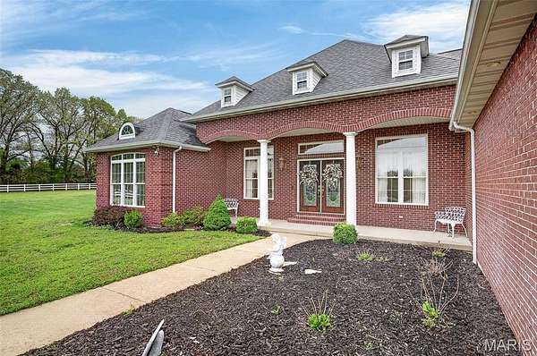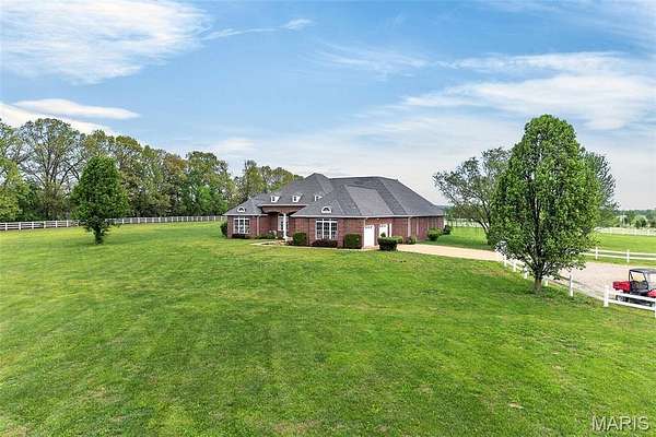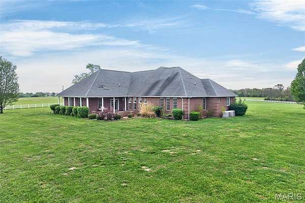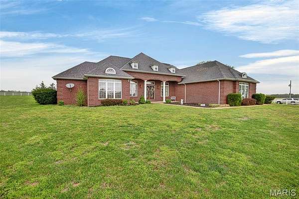 Set on 110+ acres of lush, fully fenced countryside, this distinguished brick estate offers an exceptional blend of refined interior living and expansive outdoor opportunity. Thoughtfully designed with both elegance and functionality in mind, the home welcomes you with impressive 12-foot ceilings and beautifully appointed gathering spaces throughout. The formal dining room showcases marble flooring, creating a sophisticated setting ideal for hosting. At the heart of the home, the kitchen features a large center island, granite countertops, a Jenn-Air stove, and a designated breakfast area with hardwood flooring, providing both everyday comfort and elevated entertaining space. Just beyond, the family room with an electric fireplace offers a warm and inviting retreat, while the formal double-sided sitting room adds timeless character and versatility. The spacious primary suite includes his-and-her closets and a luxurious ensuite bath complete with double vanity, jetted tub, separate shower, and an elegant crystal chandelier—a true private sanctuary. Additional highlights include an oversized laundry room with sink and extra storage, hardwired smoke detectors throughout the home, and enhanced wall insulation for comfort and efficiency. Practical upgrades continue beneath the home with a 4-foot lighted crawlspace, and peace of mind comes with a new roof currently being installed. The surrounding acreage—fertilized just last year—offers beautiful, productive land ideal for livestock, recreation, or simply enjoying the serenity of wide-open views. A rare opportunity to own a refined country estate with acreage, privacy, and thoughtful upgrades throughout. Call us to schedule your showing today.