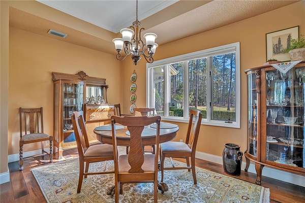 - Attic Ventilator, Ceiling Fans(s), Crown Molding, Eat-In Kitchen, High Ceilings, Kitchen/Family Room Combo, Primary Bedroom Main Floor, Solid Wood Cabinets, Split Bedroom, Stone Counters, Thermostat, Tray Ceiling(s), Vaulted Ceiling(s), Walk-In Closet(s), Window Treatments
