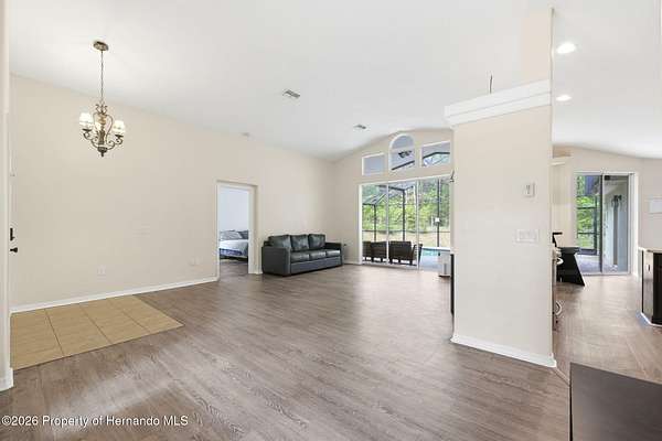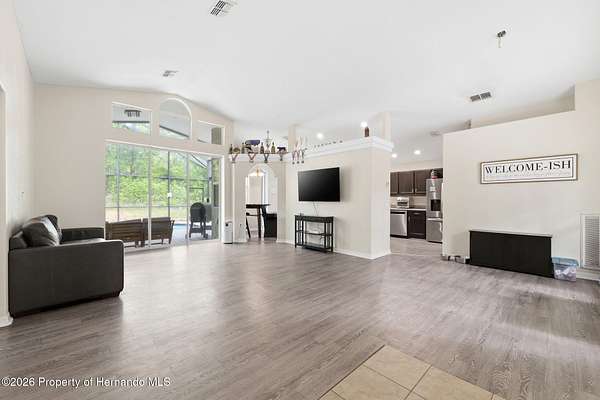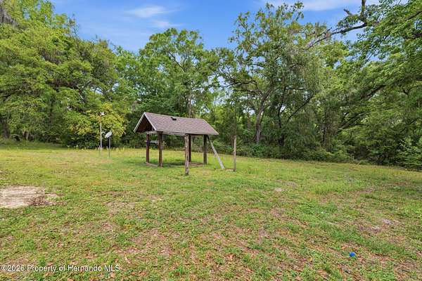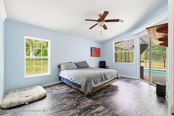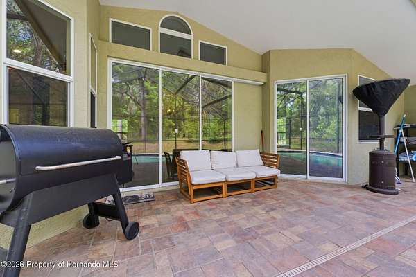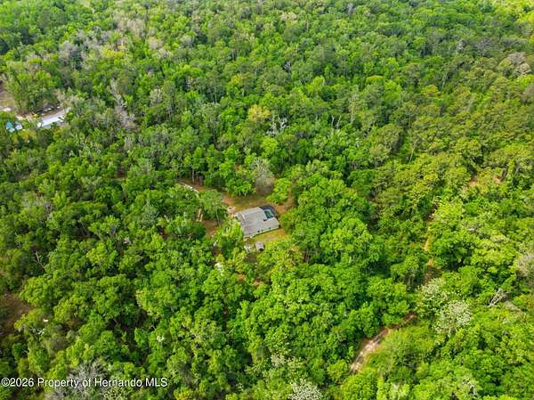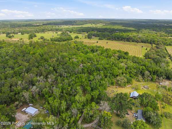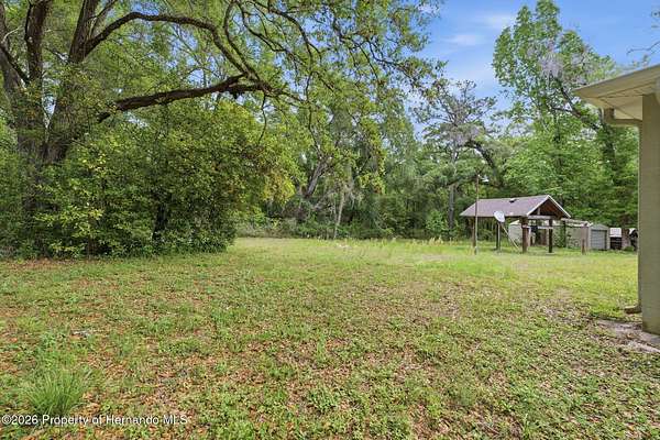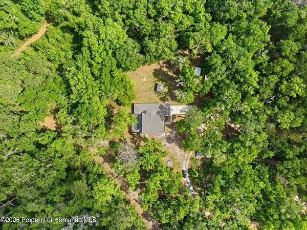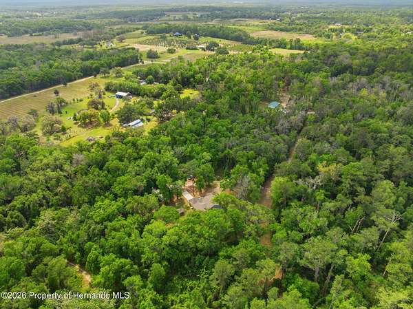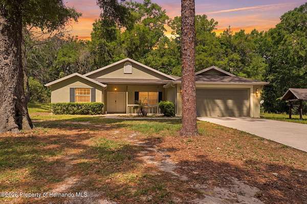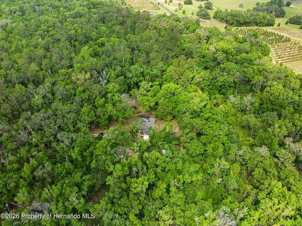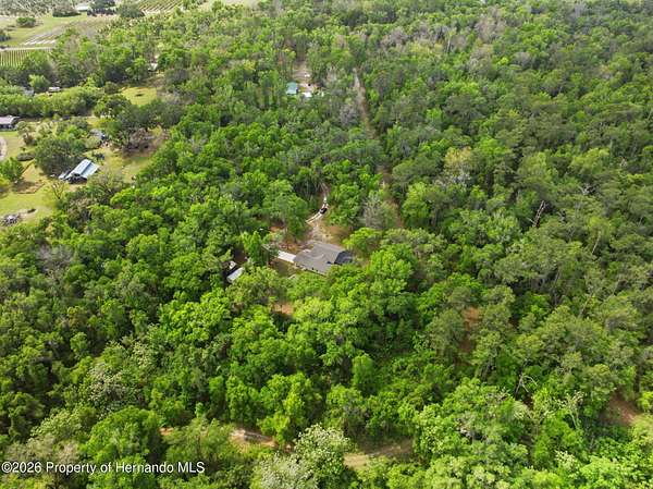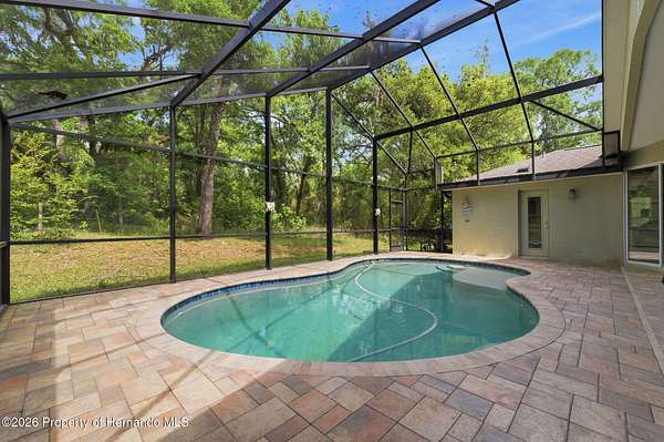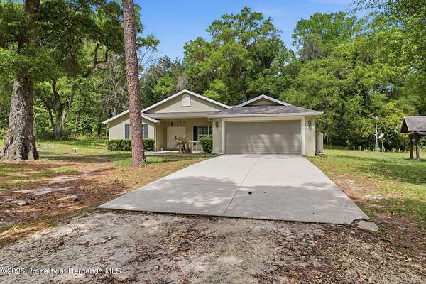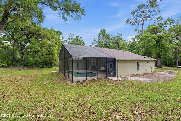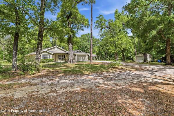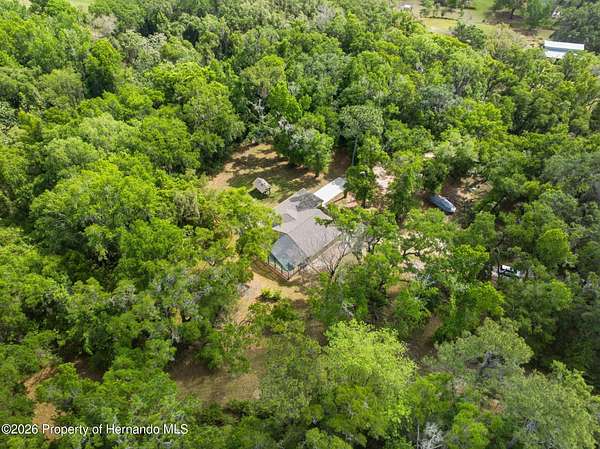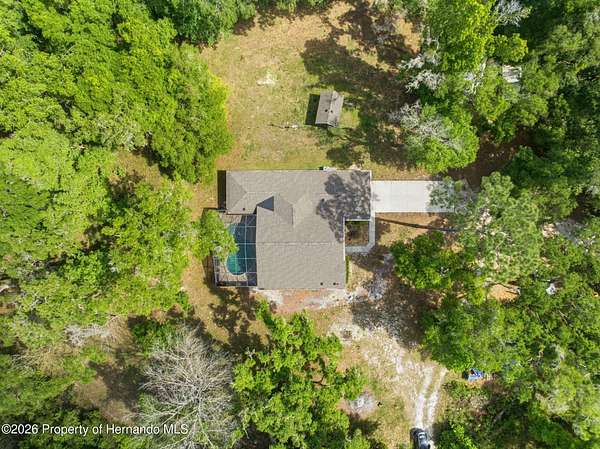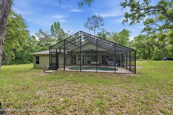 Tucked away on 5 private acres and surrounded by serene, natural woods, this beautifully secluded 3-bedroom, 2-bath split-plan home with a 2-car garage and 2 year old roof, offers the perfect blend of privacy, space, and elevated Florida living. A covered front porch invites you to slow down and enjoy the peaceful surroundings, offering plenty of room for outdoor seating before stepping through the double door entry into a wide-open living and dining space where soaring vaulted ceilings and luxury vinyl flooring create an airy, expansive feel. The living room is truly captivating, featuring a full wall of sliding glass pocket doors that disappear to seamlessly blend indoor and outdoor living, framing tranquil views of the sparkling pool and lush wooded landscape beyond. The kitchen is thoughtfully designed as its own space, offering stainless steel appliances including a state-of-the-art smart refrigerator, stone countertops, a built-in pantry, and a breakfast bar, while the adjoining breakfast nook is bathed in natural light from three windows overlooking the pool and enhanced by a charming built-in display shelf. Flowing effortlessly from the nook, the family room provides a warm and inviting retreat with a tray ceiling accented by crown molding. The primary suite is a peaceful sanctuary, complete with sliding glass doors that open directly to the pool area, a built-in shelf detail, dual closets including a spacious walk-in, and an ensuite bathroom designed for relaxation with dual vanities connected by extended counter space and additional cabinetry, a raised soaking tub framed by a window, a walk-in shower with frameless glass and built-in seating, and a private water closet. The additional bedrooms offer quiet comfort with views of the expansive yard, while the second bathroom includes a tub/shower combo and a vanity with storage. The laundry room adds everyday convenience with corridor access between the garage and kitchen and includes a utility sink. Step outside to the rear covered porch where pavered flooring and high ceilings create an inviting outdoor living space, complete with an outdoor shower and opening to a screened saltwater pool with an automatic cleaner--perfect for relaxing or entertaining while enjoying the surrounding natural beauty. The property continues to impress with mature woods that provide exceptional privacy, a large storage shed, and an additional screened structure ideal for storage or even a chicken coop. Located in Brooksville, this property offers convenient access to the charm of historic downtown with its local shops, dining, and community events, as well as nearby Weeki Wachee Springs State Park where crystal-clear waters invite kayaking and exploration, and the Withlacoochee State Forest for miles of scenic trails, creating a lifestyle that feels both peaceful and beautifully connected to nature.