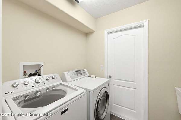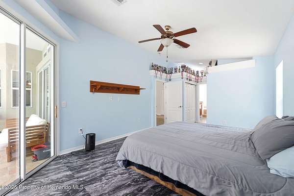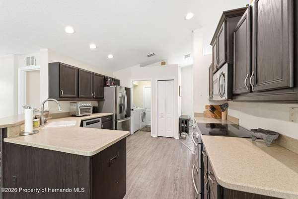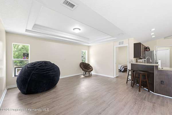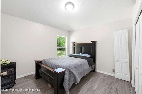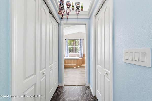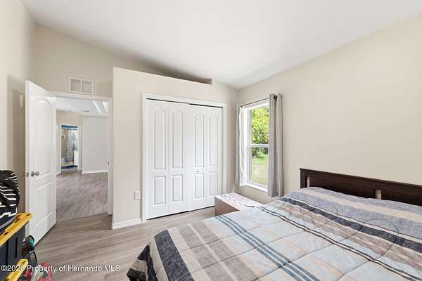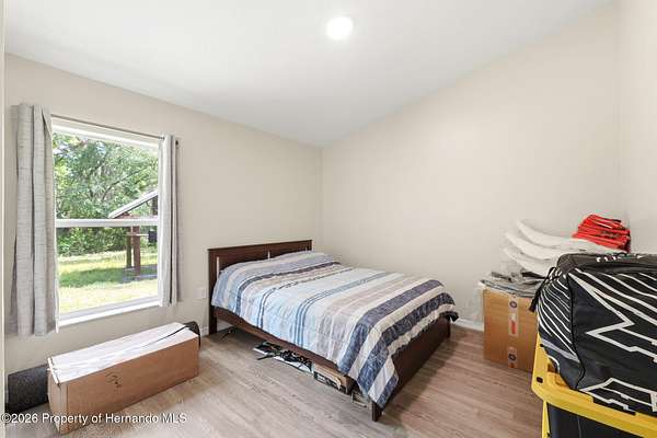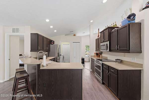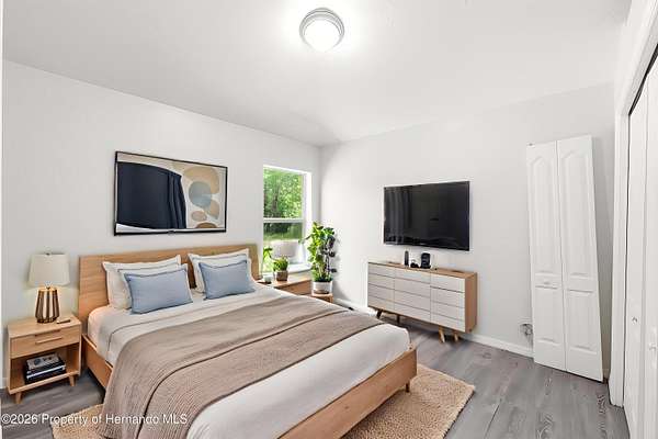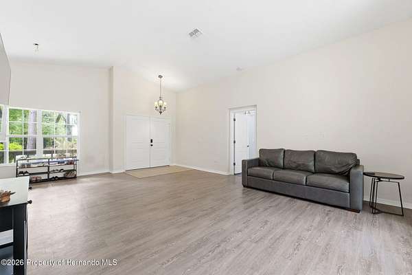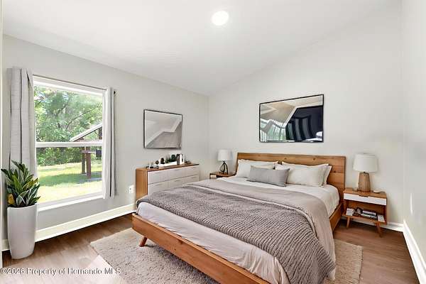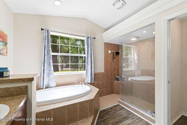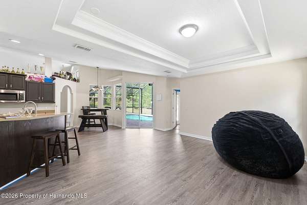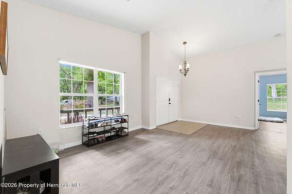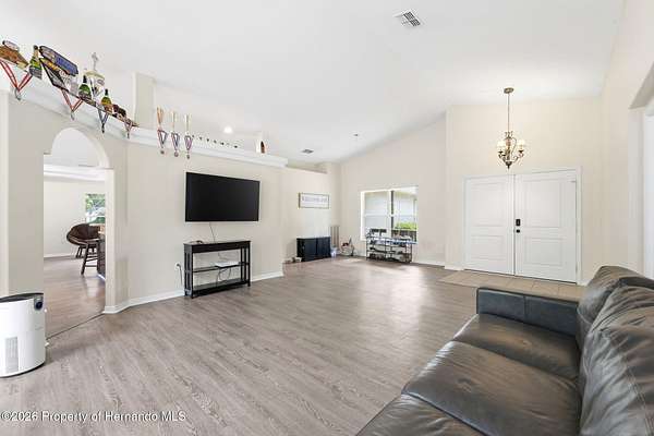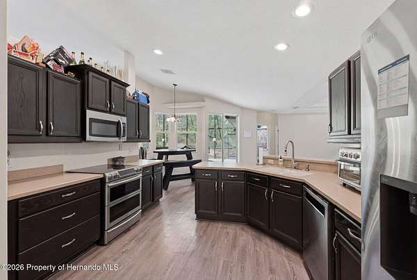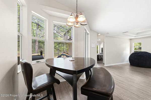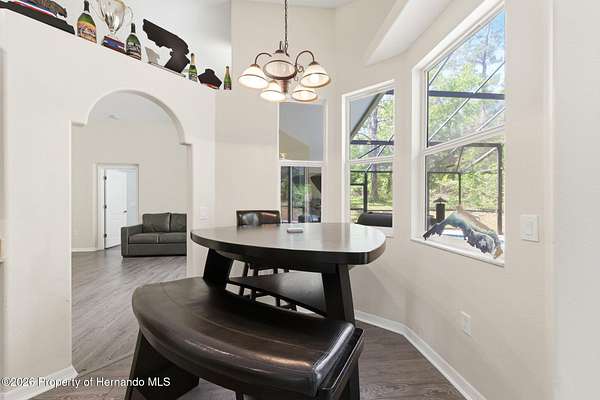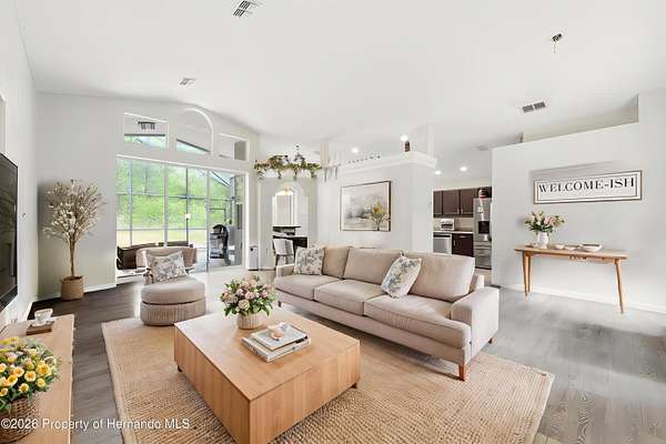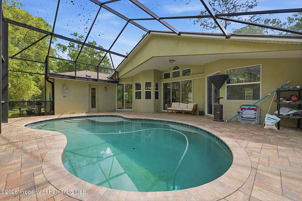Tucked away on 5 private acres and surrounded by serene, natural woods, this beautifully secluded 3-bedroom, 2-bath split-plan home with a 2-car garage and 2 year old roof, offers the perfect blend of privacy, space, and elevated Florida living. A covered front porch invites you to slow down and enjoy the peaceful surroundings, offering plenty of room for outdoor seating before stepping through the double door entry into a wide-open living and dining space where soaring vaulted ceilings and luxury vinyl flooring create an airy, expansive feel. The living room is truly captivating, featuring a full wall of sliding glass pocket doors that disappear to seamlessly blend indoor and outdoor living, framing tranquil views of the sparkling pool and lush wooded landscape beyond. The kitchen is thoughtfully designed as its own space, offering stainless steel appliances including a state-of-the-art smart refrigerator, stone countertops, a built-in pantry, and a breakfast bar, while the adjoining breakfast nook is bathed in natural light from three windows overlooking the pool and enhanced by a charming built-in display shelf. Flowing effortlessly from the nook, the family room provides a warm and inviting retreat with a tray ceiling accented by crown molding. The primary suite is a peaceful sanctuary, complete with sliding glass doors that open directly to the pool area, a built-in shelf detail, dual closets including a spacious walk-in, and an ensuite bathroom designed for relaxation with dual vanities connected by extended counter space and additional cabinetry, a raised soaking tub framed by a window, a walk-in shower with frameless glass and built-in seating, and a private water closet. The additional bedrooms offer quiet comfort with views of the expansive yard, while the second bathroom includes a tub/shower combo and a vanity with storage. The laundry room adds everyday convenience with corridor access between the garage and kitchen and includes a utility sink. Step outside to the rear covered porch where pavered flooring and high ceilings create an inviting outdoor living space, complete with an outdoor shower and opening to a screened saltwater pool with an automatic cleaner--perfect for relaxing or entertaining while enjoying the surrounding natural beauty. The property continues to impress with mature woods that provide exceptional privacy, a large storage shed, and an additional screened structure ideal for storage or even a chicken coop. Located in Brooksville, this property offers convenient access to the charm of historic downtown with its local shops, dining, and community events, as well as nearby Weeki Wachee Springs State Park where crystal-clear waters invite kayaking and exploration, and the Withlacoochee State Forest for miles of scenic trails, creating a lifestyle that feels both peaceful and beautifully connected to nature.