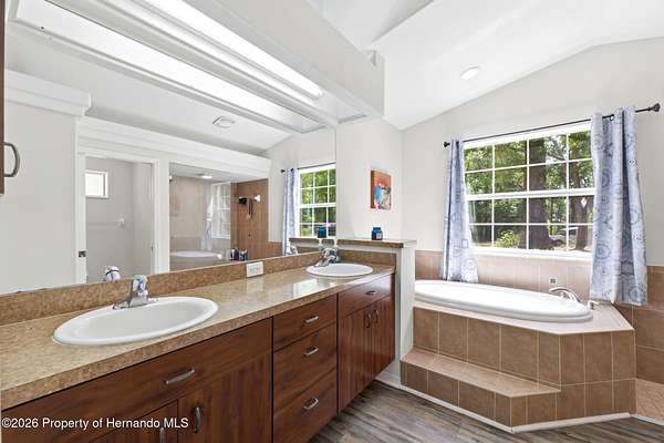 - Breakfast Bar, Breakfast Nook, Built-In Features, Ceiling Fan(s), Double Vanity, Eat-In Kitchen, Entrance Foyer, His and Hers Closets, Pantry, Primary Bathroom -Tub With Separate Shower, Primary Downstairs, Split Bedrooms, Split Plan, Vaulted Ceiling(s), Walk-In Closet(s)