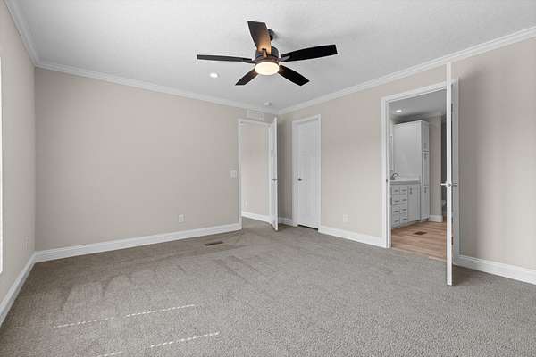 The primary suite is a private retreat with a generous bedroom and a well-appointed bathroom. Enjoy built-in shelving, a soaking tub, a separate walk-in shower, dual vanities, and a walk-in closet designed for ample storage. Three additional bedrooms, all comfortable in size, share a conveniently located hallway bath.