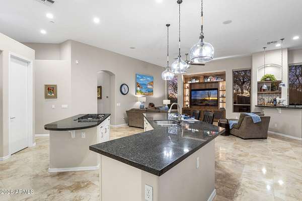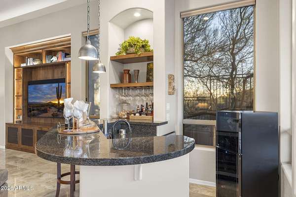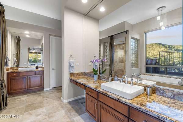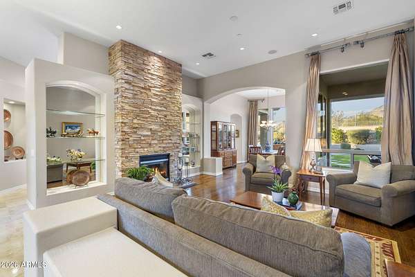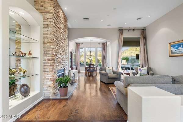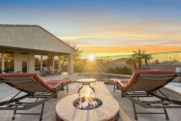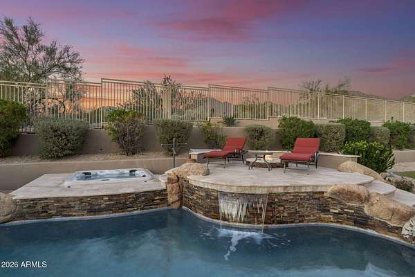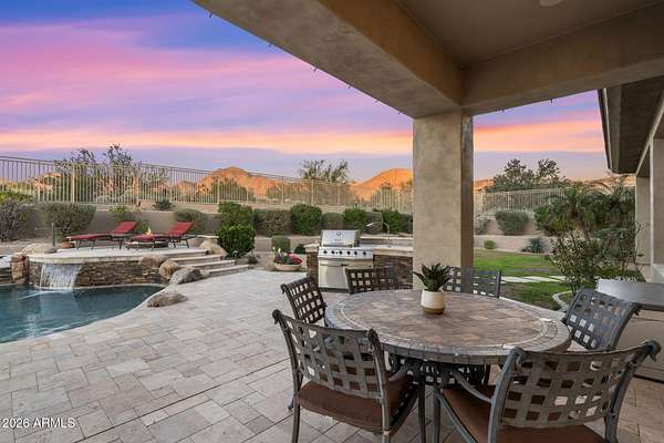 Privately set on 3.5 acres against the McDowell Mountain Preserve, this exceptional residence offers sweeping mountain and city views from nearly every room & is located within an intimate Sonoran Estates enclave of just 25 homes. The property features soaring 12-foot ceilings w/ elegant formal living & dining spaces, plus a chef-inspired kitchen that opens to the family room for effortless everyday living & entertaining, complete w/ stainless appliances, refreshed cabinetry, a sit-up bar w/ sink & wine fridge. The well-designed layout includes 4 beds w/ spacious primary suite, 3.5 baths, + den. Outdoors, enjoy a refreshing pool & spa framed by dramatic mountain vistas, a built-in gas barbecue & expansive space for entertaining or play, w/ seamless indoor-outdoor flow from family room.