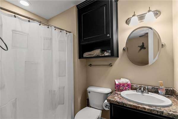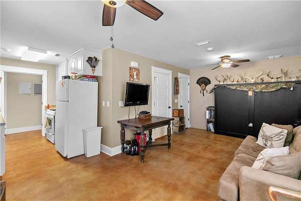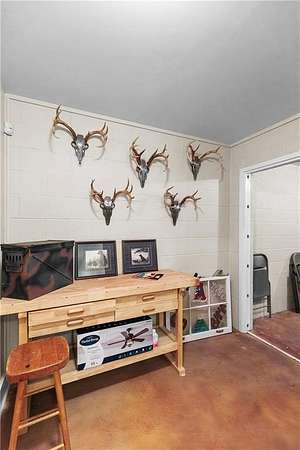 The finished basement is a standout feature, including a large safe room and a self-sufficient suite with a bed, sofa, full bath, and a kitchen designed to operate on gas in case of a power outage. The basement also houses a small office and a single-car garage with ample storage.
