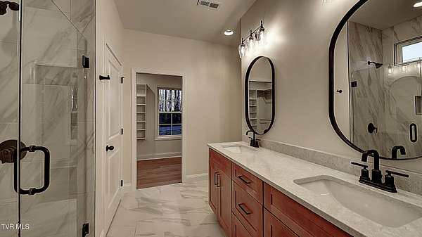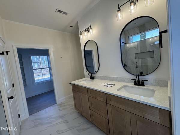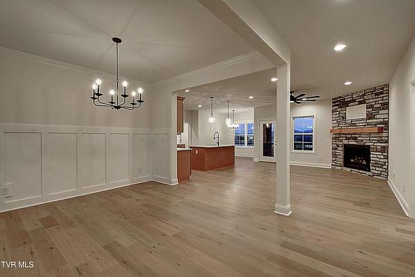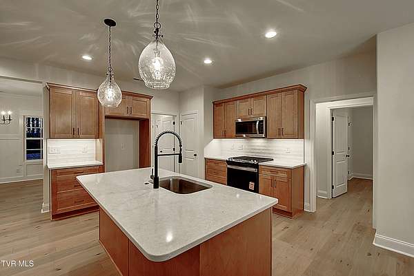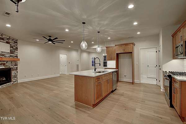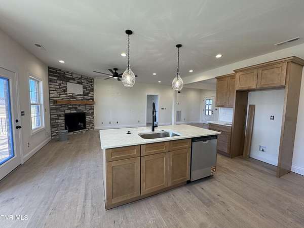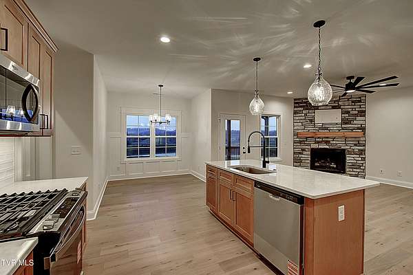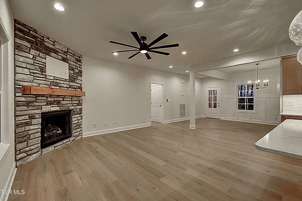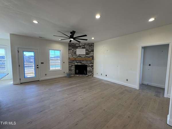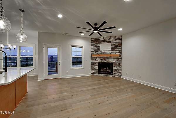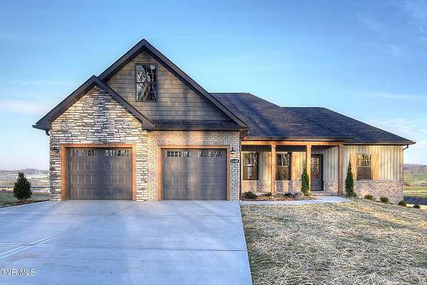 Welcome to refined new construction in The Glades at Hawley Meadows, where luxury, space, and thoughtful design come together on a picturesque 1.7-acre homesite. This exceptional residence offers 3 bedrooms, 3 full baths, TWO private office/flex spaces, and TWO expansive living areas, creating a perfect balance of elegance and functionality. The open-concept main level is anchored by a dramatic floor-to-ceiling custom stone natural gas fireplace and flows seamlessly to the covered back deck-ideal for both entertaining and quiet evenings overlooking the countryside. The gourmet kitchen is a true showpiece, featuring abundant shaker-style cabinetry with soft-close doors and drawers, quartz countertops, designer tile backsplash, stainless steel appliances with gas range, walk-in pantry, and an oversized island overlooking the main living space. The primary suite is a luxurious retreat, showcasing dual vanities with quartz countertops, a custom 5' tiled shower, accent wall, and a spacious walk-in closet with custom shelving. Two additional main-level bedrooms are privately positioned on the opposite wing of the home and share a beautifully appointed full bath. The partially finished walk-out lower level offers exceptional versatility and is ideal for guests or multi-generational living, featuring a fourth bedroom, additional office, full bath, and inviting den area, plus over 1,000 square feet of unfinished space for storage or future expansion. Premium upgrades include hardwood and tile flooring throughout (no carpet), natural gas service for HVAC, tankless water heater, range, and fireplace, and quality craftsmanship at every turn. Enjoy serene views from the covered back deck and the privacy of a large lot in this exclusive new community conveniently located in Blountville. A rare opportunity to own a luxury new construction home combining modern elegance with peaceful countryside living. All information herein deemed reliable but subject to buyers verification. Estimated completion- March 2026.