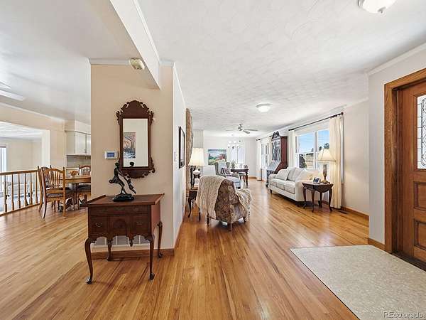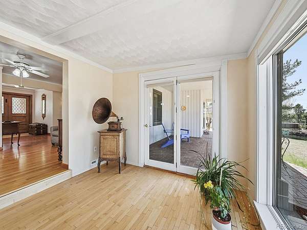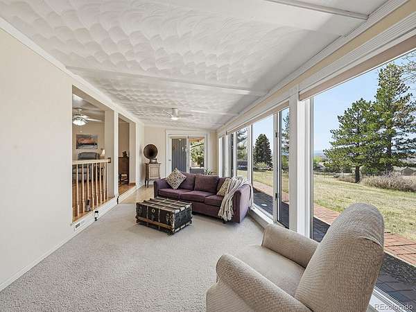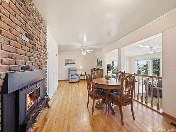 Inside, the bright and welcoming living room features a striking stone wood-burning fireplace—perfect for cozy Colorado evenings. The dining room is perfect for large gatherings. The primary suite serves as a private retreat, complete with dual closets and an en-suite bathroom. The kitchen is thoughtfully designed with modern appliances and opens to a comfortable dining area, ideal for gatherings. Just beyond, the sunroom offers a peaceful space to enjoy your morning coffee while taking in sweeping panoramic views of the Front Range, along with stunning sunsets and sparkling city lights.
