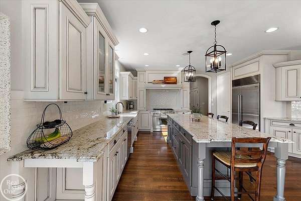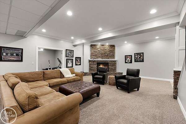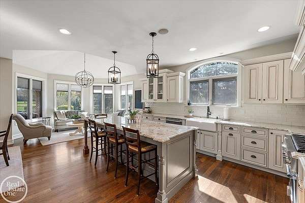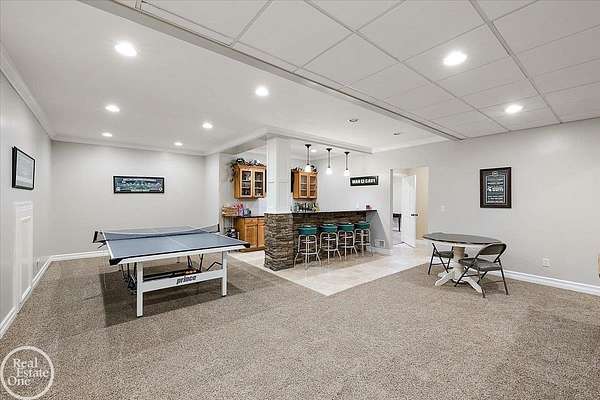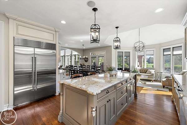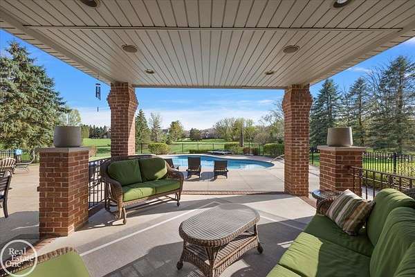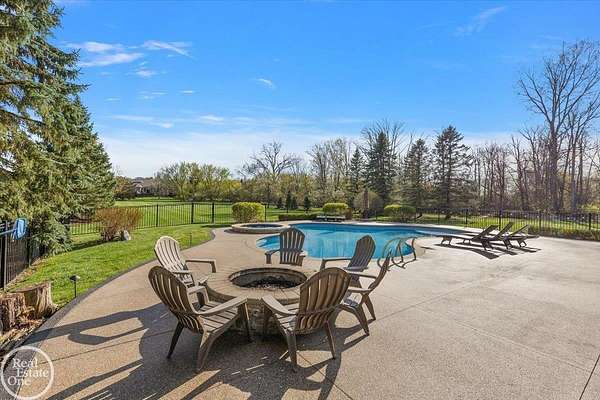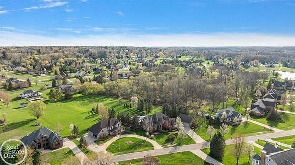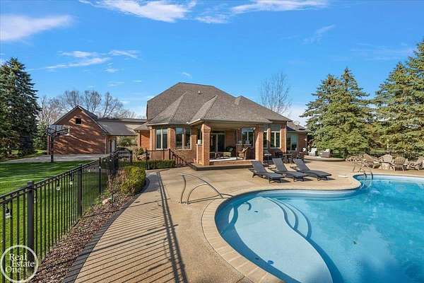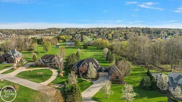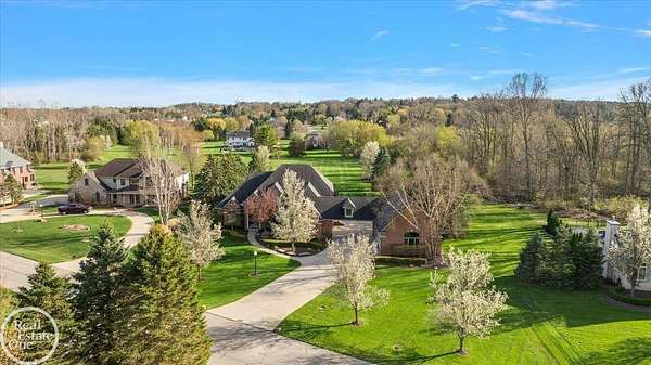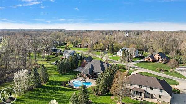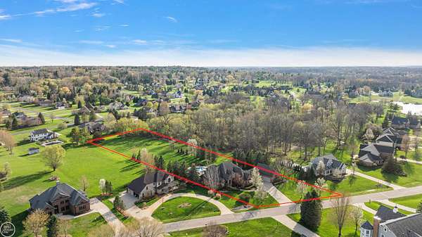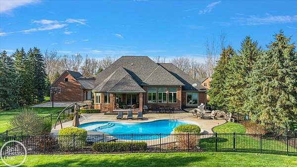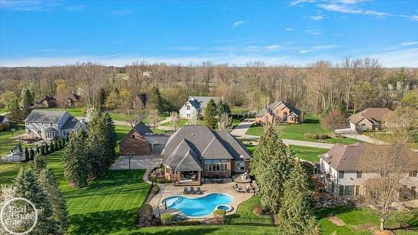 Stunning 1 1/2 story home with finished basement on private 1.72-acre lot with built-in swimming pool & 6-car garage. Hard to find a home with the amenities & finishes this home has to offer. Large chef's gourmet island kitchen with built-in commercial grade appliances. Spacious 1st floor primary suite w/ luxury bath, oversized walk-in closet & door-wall to pool. 3- large bedrooms upstairs all with private bath access. Finished lower-level features wet bar, 2nd kitchen, 5th bedroom, fireplace & wide-open entertaining area. Fantastic pool area & patios with custom inground pool & hot tub. Private back yard extends apprx. 300' past fenced area offering a great play space for kids. 2nd 3-car garage has stairs to upstairs attic bonus room. All high end finishes throughout. City Sewer, no septic.