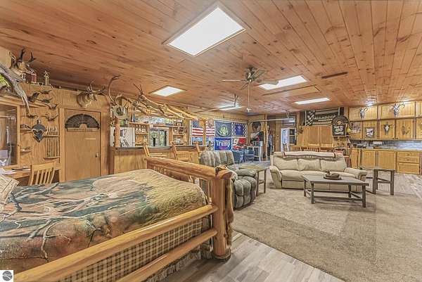 Adventure, privacy, and outdoor living await on 6+ wooded acres surrounded by State Land in beautiful Wexford County, Michigan. Enjoy direct access to ORV, ATV, and snowmobile trails plus endless opportunities for hunting, hiking, and exploring right out your back door. The main home is a 2 bed / 2 bath, 1,281 sq ft featuring an open-concept kitchen and dining area, cozy stone fireplace, and a spacious primary suite. Relax on the covered front porch and take in the peaceful wooded setting. Just steps away, a custom barndominium-style lodge offers the ultimate guest retreat or entertainment space, complete with a full kitchen, wet bar, wood stove, flex bedroom, and nearly 800 sq ft covered patio/carport for vehicles or outdoor gatherings. A private motocross / side-by-side / snowmobile track winds through the property -- perfect for recreation enthusiasts. With State Land access, this property is ideal for hunters, off-roaders, and nature lovers alike. Whether you're searching for a family compound, vacation getaway, or sportsman's paradise, this one-of-a-kind Northern Michigan property delivers comfort, versatility, and adventure in one package.