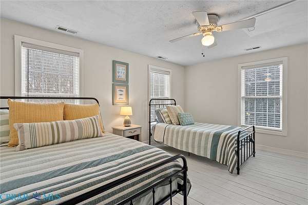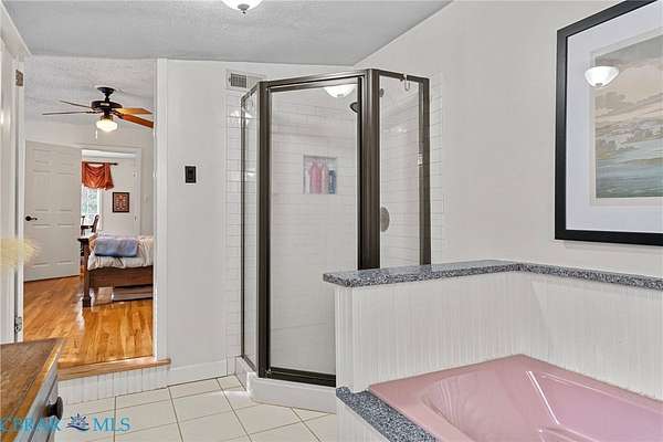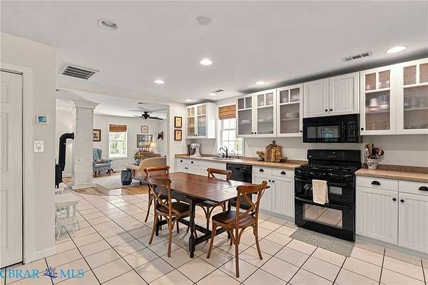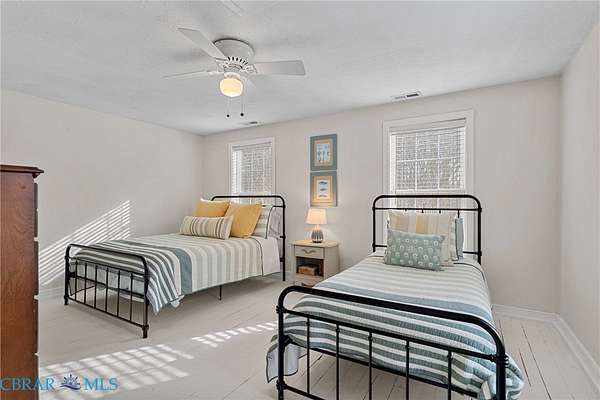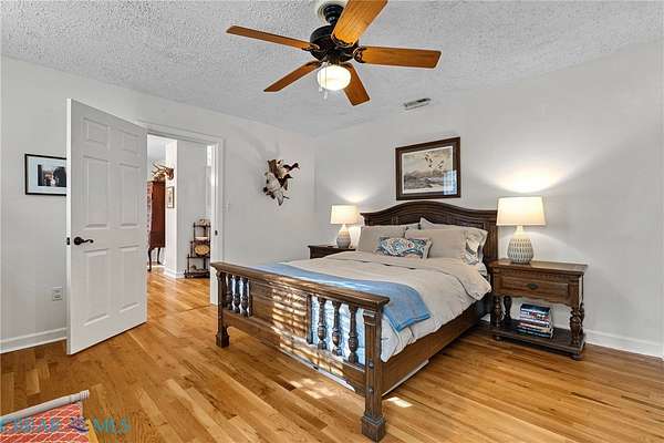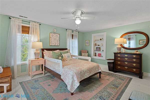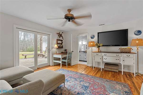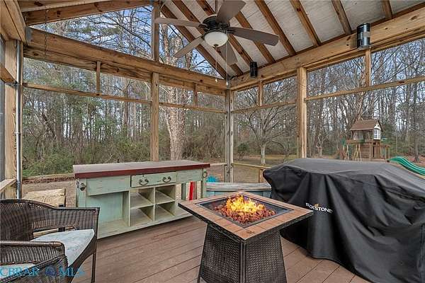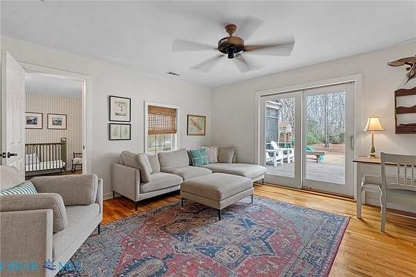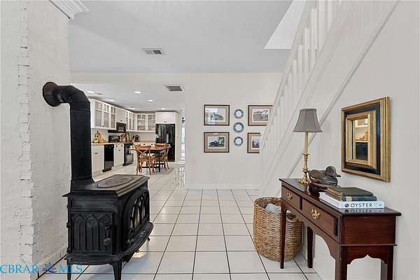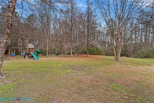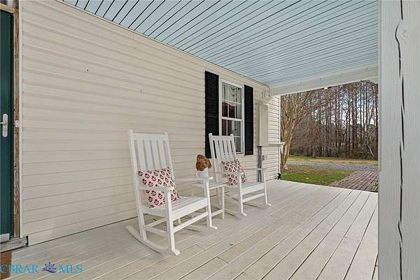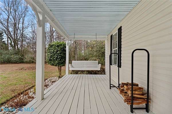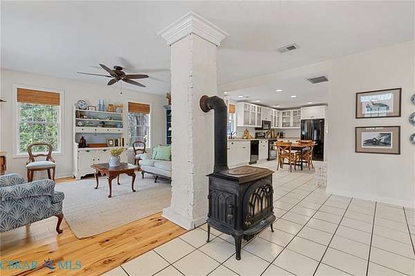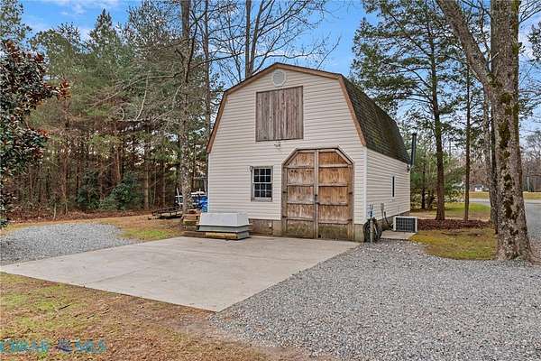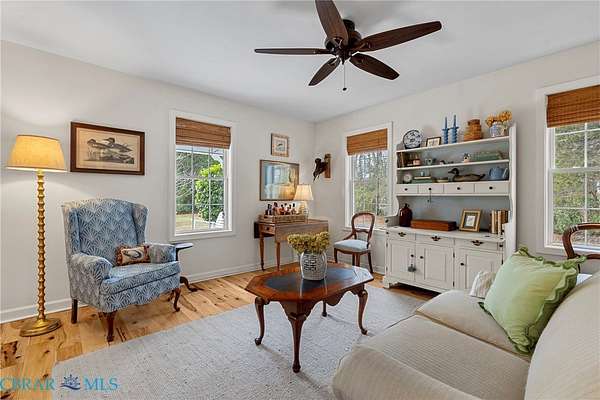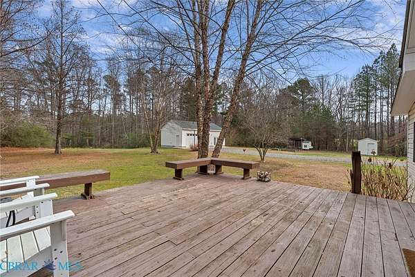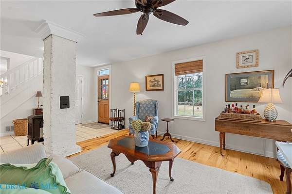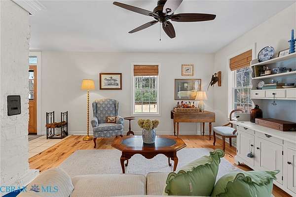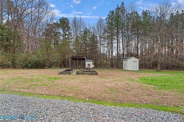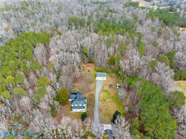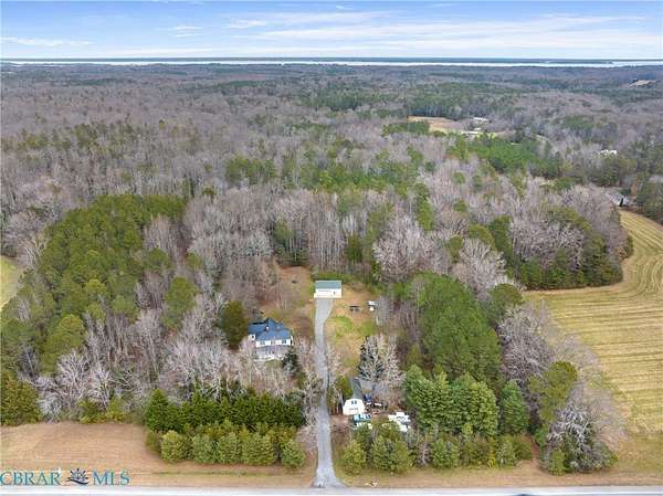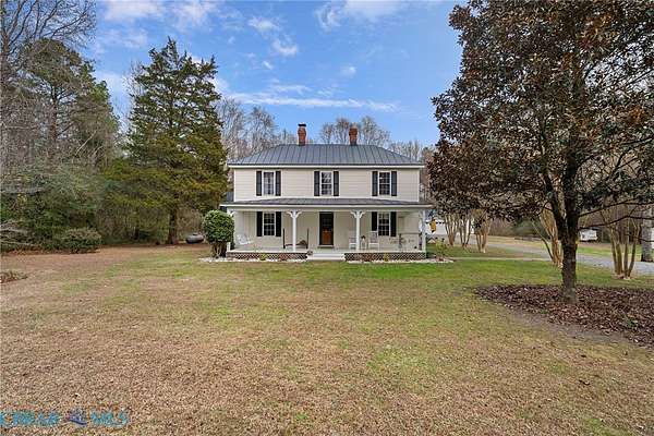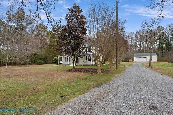 Tucked beneath mature magnolias and flowering trees, 11495 Tidewater Trail is a beautifully preserved circa-1800 Virginia farmhouse set on nearly 4 private acres, just minutes from the heart of Urbanna. Framed by mature landscaping and wooded trails, the property offers a private setting with easy access to nearby waterfront towns and deep water marinas. The main level is thoughtfully arranged for both everyday living and entertaining, offering two distinct living spaces, a formal dining room, a flexible office or nursery, and a first-floor primary bedroom and bath. Warm wood and tile flooring create a welcoming flow throughout. The kitchen blends classic farmhouse character with thoughtful updates, featuring glass-paneled cabinetry, quartz countertops, and tile flooring, and connects easily to the home's living areas. One living space centers around a cozy wood-burning stove, while the second provides additional room to relax or gather. The two bedrooms upstairs are generously sized, offering comfort and flexibility rarely found in homes of this era. Outdoor living is a standout feature, with a covered front porch and swing, back deck, and covered screened gazebo ideal for enjoying quiet mornings and entertaining. Walking trails wind through the wooded acreage, and mature trees provide privacy and seasonal beauty. Additional structures include a detached two-car garage, a separate workshop with power and climate control, chicken coop and pump house. This classic farmhouse offers timeless character, flexible living space, nearby waterfront towns and relaxed Southern living in a truly special setting.