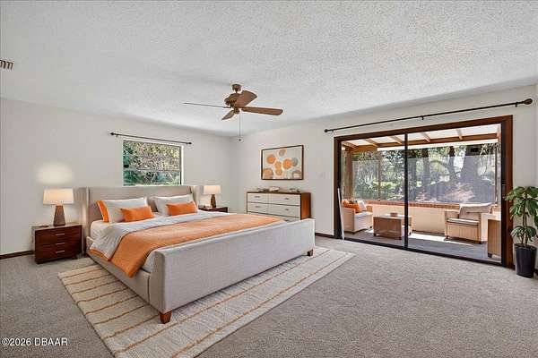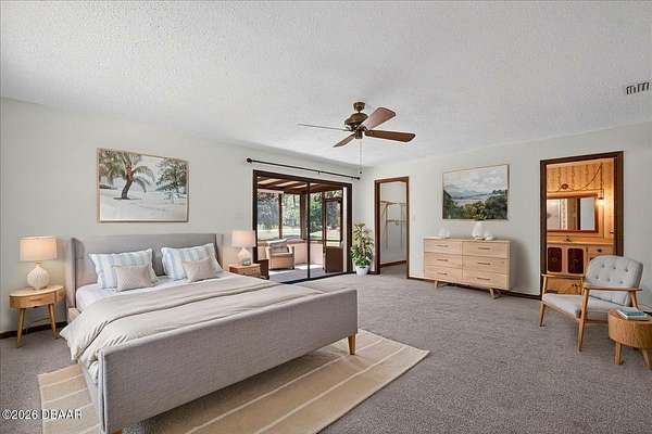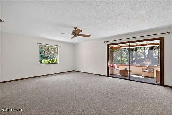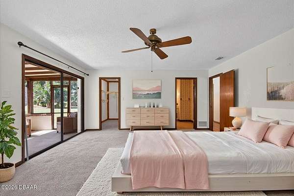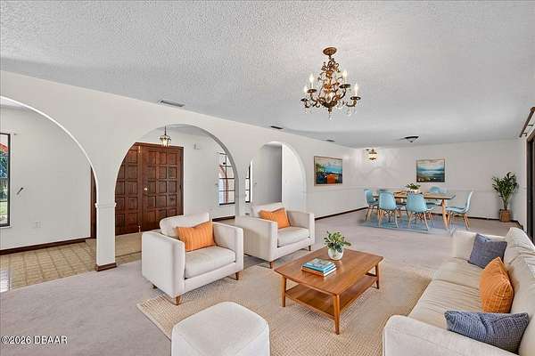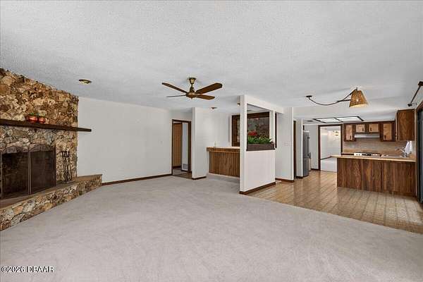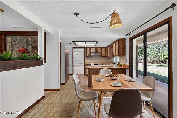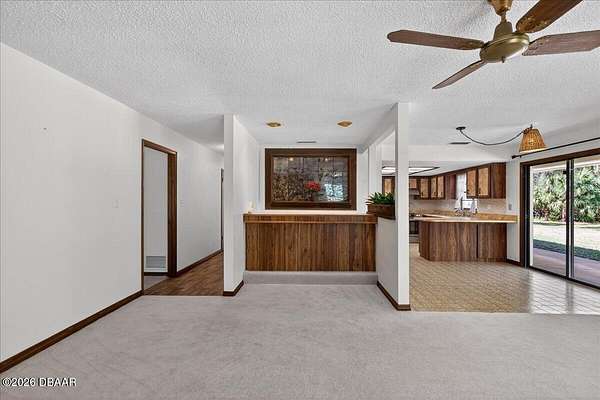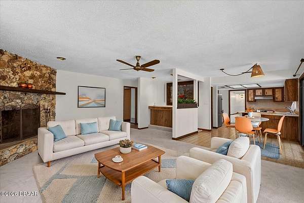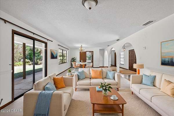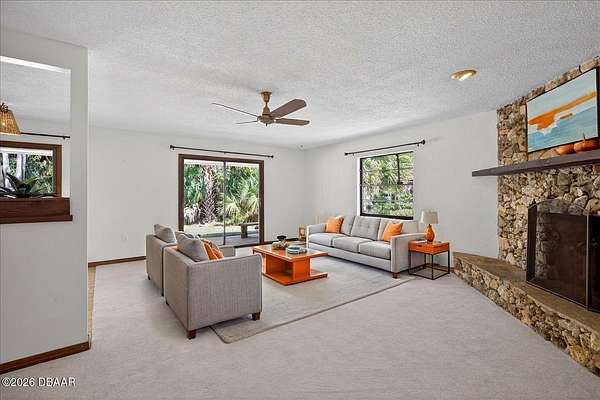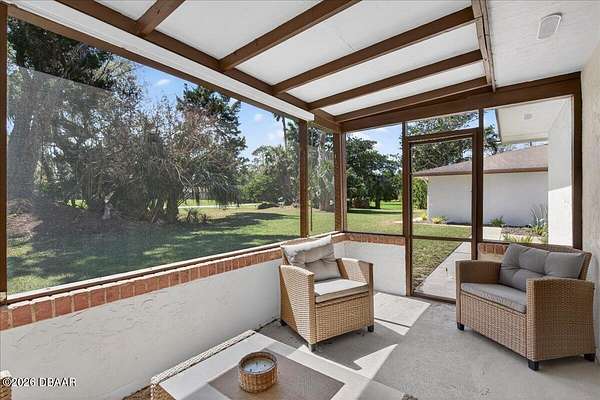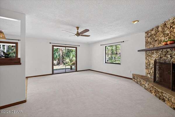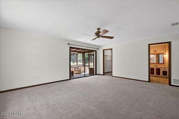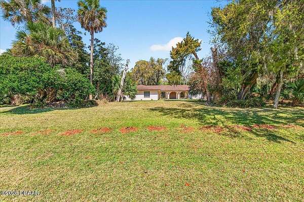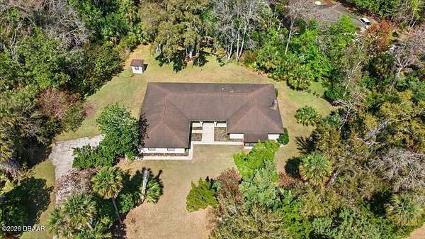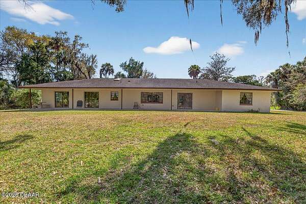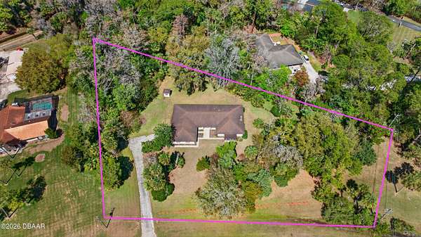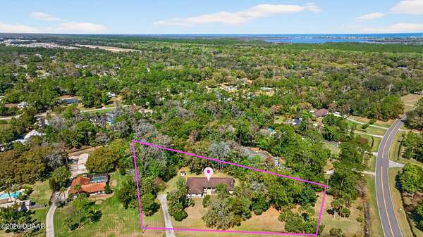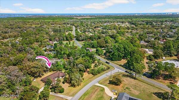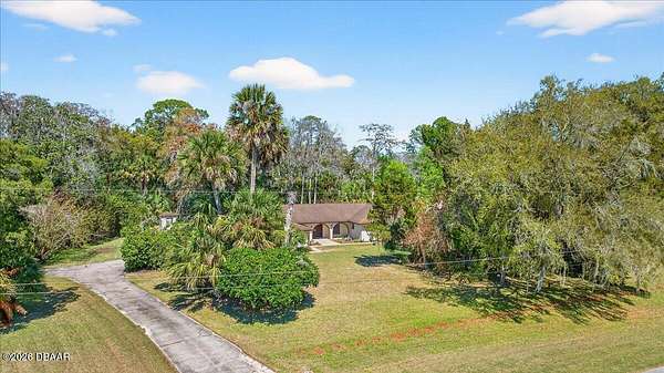 Welcome to 115 Addison Dr, a sprawling home situated on 1.53 acres on a corner lot in the sought-after Village of Pine Run. Surrounded by mature trees and natural beauty, this property offers privacy, space, and the peaceful charm of nature right in your backyard. As you enter through the double wooden entry doors, you are welcomed by beautiful archways that lead into the open living and dining areas, both overlooking the wooded backyard filled with majestic trees and frequent visits from the friendly deer that are known to roam the neighborhood. The kitchen features new stainless steel appliances and a newly tiled bar area, perfect for entertaining. Spanish-style tile flooring runs throughout the kitchen, dining area, and foyer, adding character and warmth to the home. Just off the kitchen is an inviting family room with a unique coquina rock wood-burning fireplace, creating the perfect space for relaxing evenings. The expansive primary suite offers a peaceful retreat with its private screened porch, where you can enjoy views of the surrounding nature. The suite also includes a walk-in closet and an ensuite bathroom. On the opposite side of the home are two generously sized bedrooms and a guest bathroom with a tub and shower combination, providing a comfortable layout for family or guests. With over 2,700 square feet of living space, this home offers incredible potential and character, ready for the next owner to make it their own. The property sits on 1.53 acres with an extended driveway, offering plenty of space to bring your RV, boat, or other toys. Updates include: New carpet in bedrooms (January 2025) New laminate flooring (January 2025) Fresh interior and exterior paint (January 2025) New garage door (April 2018) New A/C unit (July 2017) Septic tank and drain field (August 2012) Dimensional shingle roof (April 2012) If you are looking for space, privacy, mature trees, and a home full of character on over an acre and a half, this property offers a rare opportunity in the Village of Pine Run.
