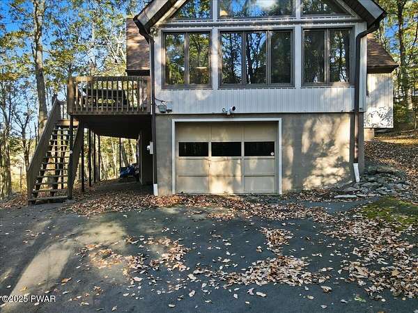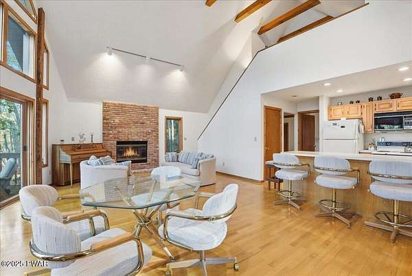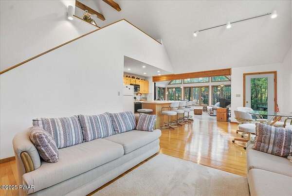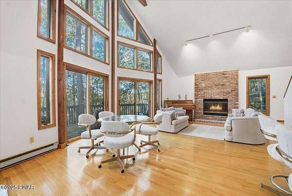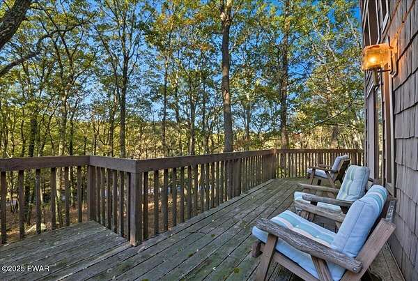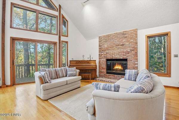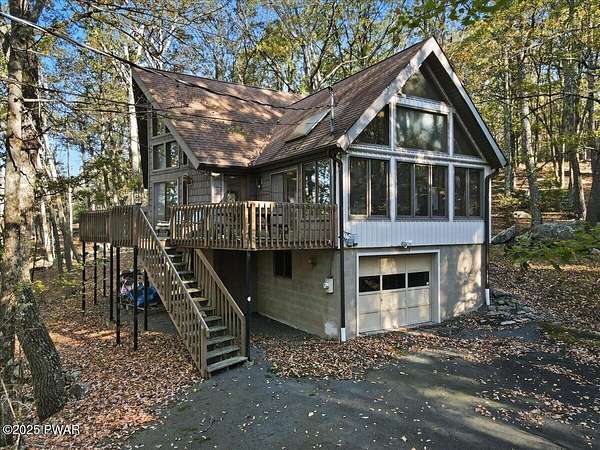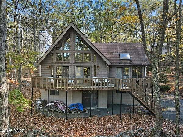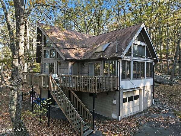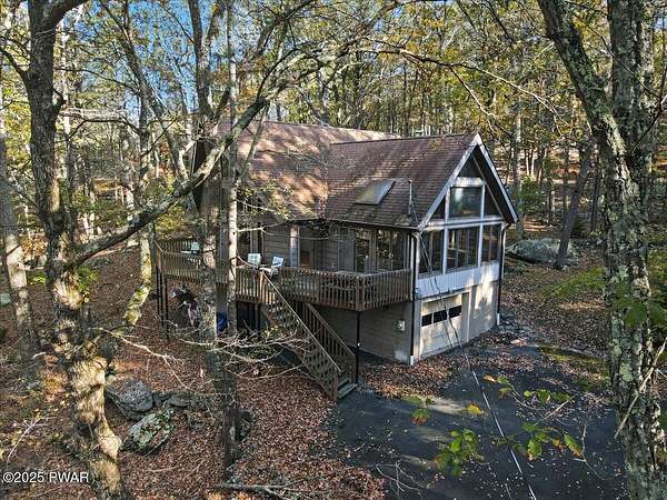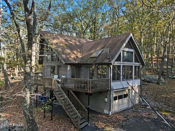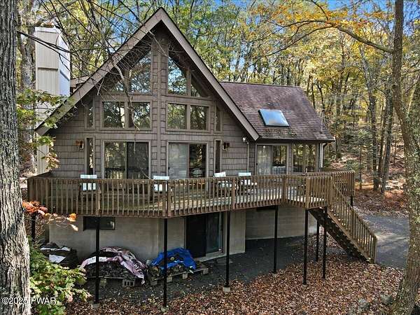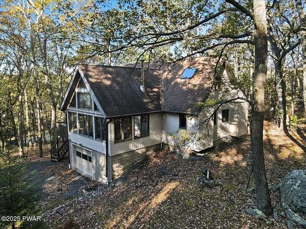 A True Mountain Chalet on triple lot, Perched high on a serene 2.6 acre hilltop, this prow front chalet is in the treetops. ORIGINAL OWNER, The charm is the cathedral ceilings with huge glass facade overlooking forested land. Open living area to entertain with a brick fireplace, and beautiful hardwood floors throughout, a paved driveway and garage, a unique opportunity for a family year round home or vacation getaway in amenity filled Hemlock Farms. The fabulous sunroom is great in All seasons bringing the outdoors into the comfort of your home. A basement with family room and extra guest room offers space for a guests and extended family. Come take a look! This is a True Gem.