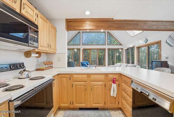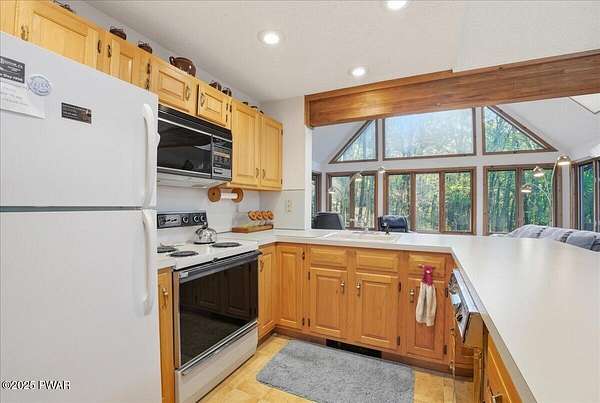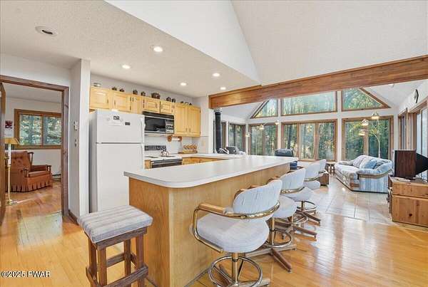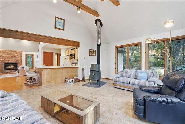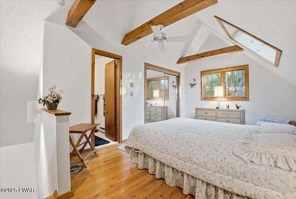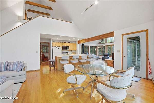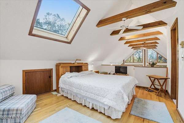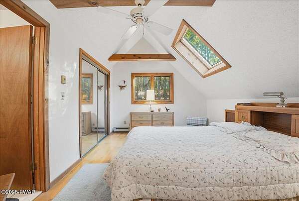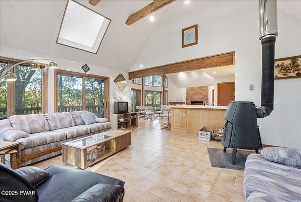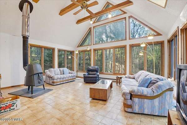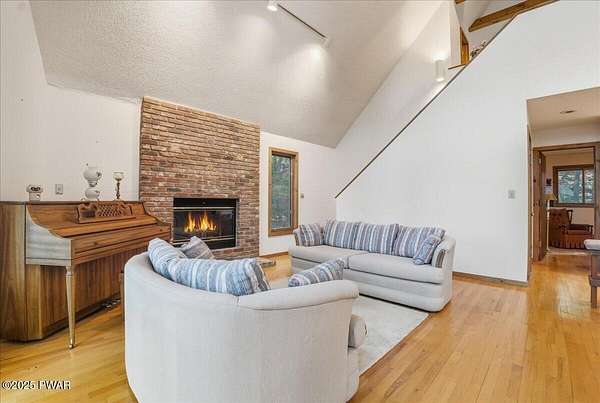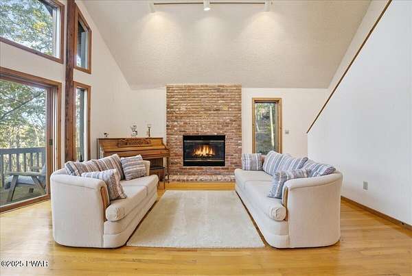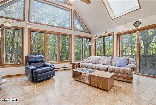 A True Mountain Chalet on triple lot, Perched high on a serene 2.6 acre hilltop, this prow front chalet is in the treetops. ORIGINAL OWNER, The charm is the cathedral ceilings with huge glass facade overlooking forested land. Open living area to entertain with a brick fireplace, and beautiful hardwood floors throughout, a paved driveway and garage, a unique opportunity for a family year round home or vacation getaway in amenity filled Hemlock Farms. The fabulous sunroom is great in All seasons bringing the outdoors into the comfort of your home. A basement with family room and extra guest room offers space for a guests and extended family. Come take a look! This is a True Gem.