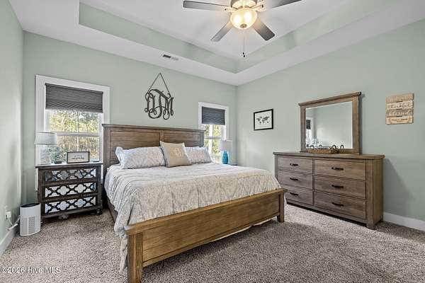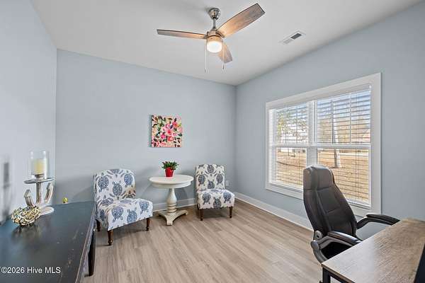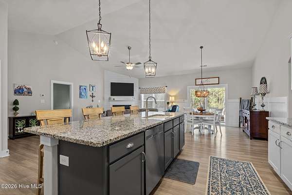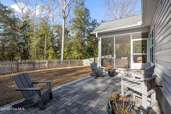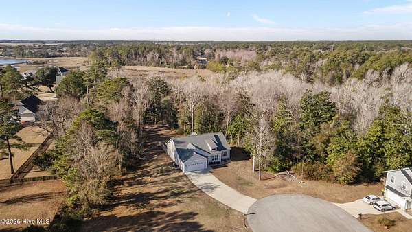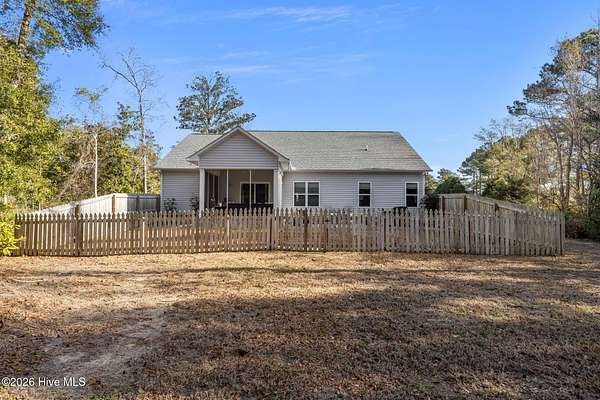 This single-story J C Jackson home offers three bedrooms and two bathrooms, located in the desirable Eli's Landing community in Newport, NC. The property seamlessly integrates comfort, convenience, and coastal lifestyle within an elegant setting. The home features a thoughtfully designed open floor plan focused on a spacious kitchen with a large island, which is well-suited for entertaining guests. A dedicated office provides an ideal environment for remote work or creative endeavors. Additional amenities include a two-car garage, tankless water heater, and a screened porch that leads to a patio equipped with a natural gas hookup for grilling. The fenced backyard ensures privacy and space for recreation, while the primary suite offers two generous walk-in closets. Positioned on 2.83 acres at the end of a quiet cul-de-sac, this residence combines generous space and tranquility with exceptional accessibility. It is situated just 15 minutes from public beach access at Emerald Isle, and only a short drive to Atlantic Beach, Beaufort, and Morehead City, where residents can enjoy outstanding shopping, dining, and coastal attractions.