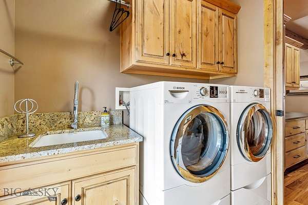 A separate guest house provides even more flexibility, offering its own kitchenette and living area for visitors, extended family, or rental potential. The oversized two-car garage has plenty of room for recreational gear and equipment, supporting your Montana adventures year-round.