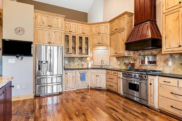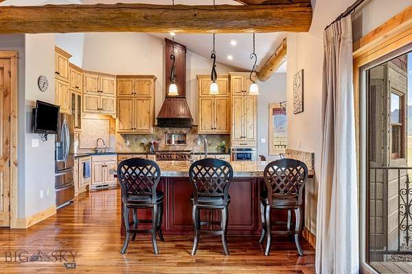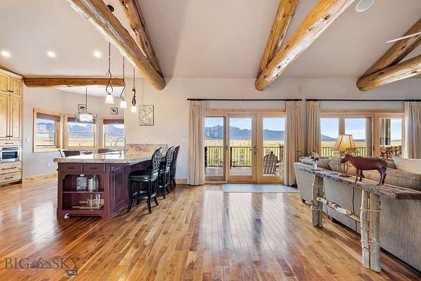 Thoughtfully designed for both everyday living and memorable entertaining, the main home blends Montana charm with modern amenities. Large windows throughout frame the breathtaking mountain vistas, while the open-concept living area features vaulted ceilings, a cozy fireplace, and a seamless flow into the kitchen and dining spaces. The kitchen is a chef's dream, with high-end appliances, custom cabinetry, and ample room for gathering with friends and family.