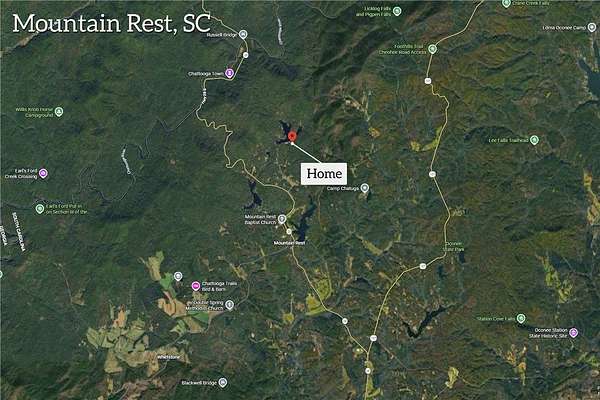From Walhalla take Hwy 28 to Mnt. Rest. Stay left on Hwy 28 at the 28/107 fork, stay left for approximatly 3 miles. Turn R onto Chattooga Lake Rd. Enter CLC gate, travel across dam, Little Stakey Rd on the R. House is up the hill on the L.