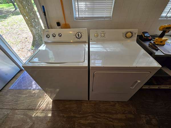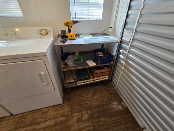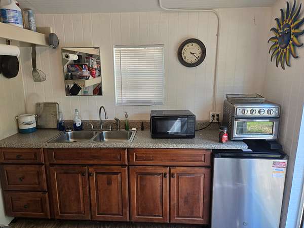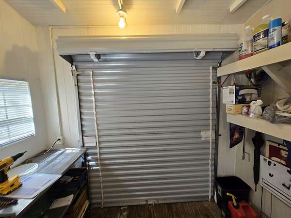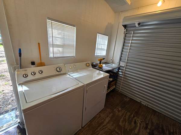 A versatile utility building (263 square feet under roof, 138 square feet enclosed) includes a 6' roll-up door, indoor and outdoor storage, and a fully equipped workspace that doubles as a kitchen, laundry room, and tool shed. Features include a washer, dryer, mini-fridge, sink, cabinets, microwave, toaster oven, LP gas stove, and an instant hot water heater--plus an outdoor shower for convenience.