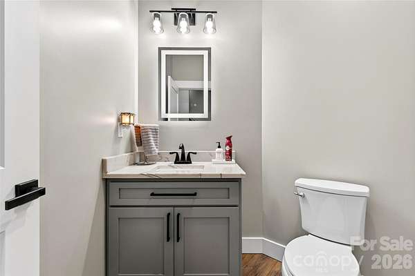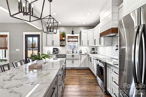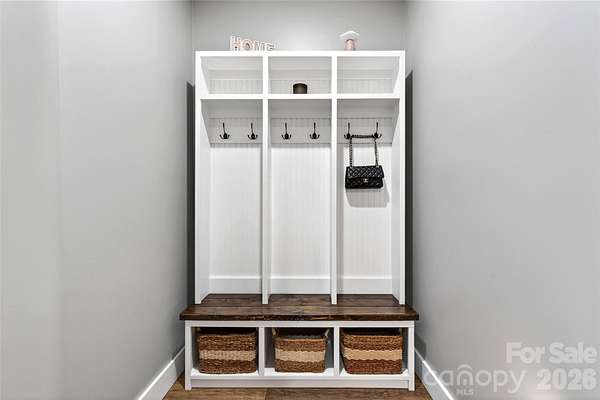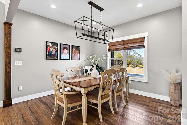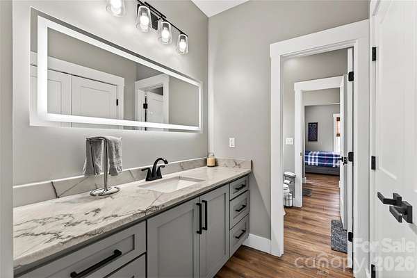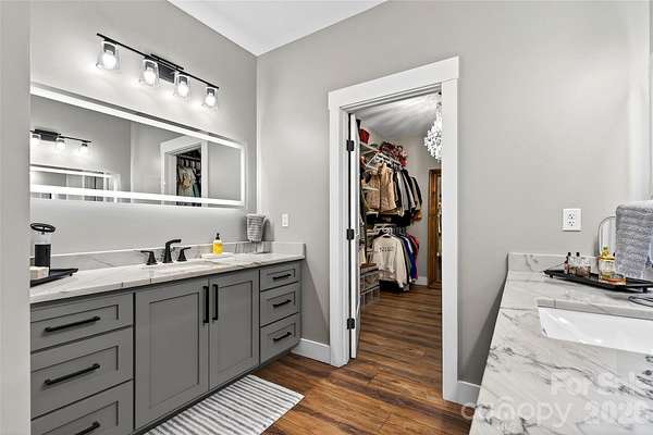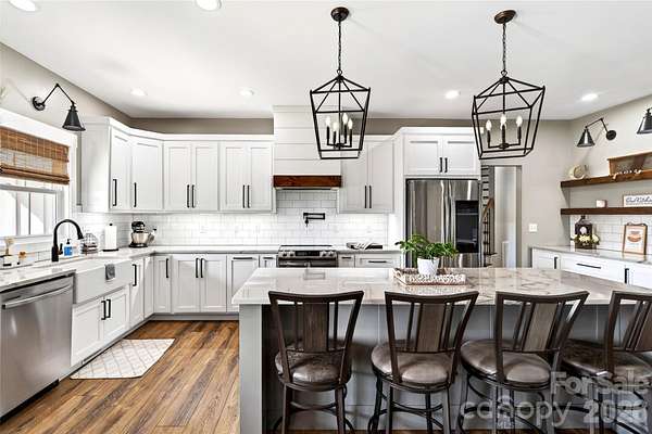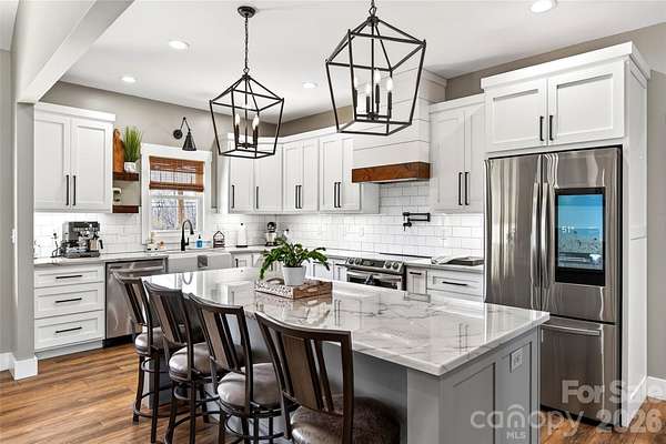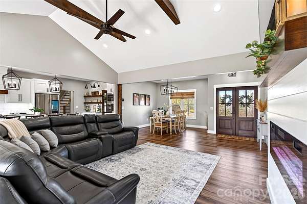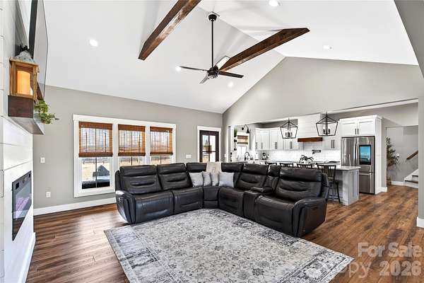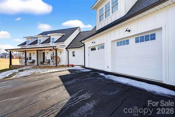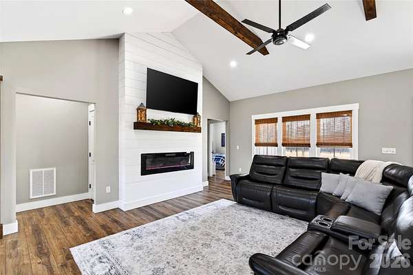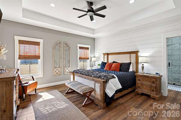 Welcome to this stunning custom-built modern farmhouse, located in the gated community of Bent Creek. The home was completed in 2022 and thoughtfully crafted with high-end finishes and functional living spaces throughout. This exceptional home seamlessly blends timeless charm with modern design, offering both everyday comfort and refined style. Luxury wide-plank vinyl flooring runs throughout the home, complementing the open-concept layout that flows effortlessly from the welcoming foyer into the spacious living room and chef's kitchen. Exposed knotty alder wood beams and a striking shiplap fireplace create warmth and architectural character, making the main living area both elegant and inviting. The chef's kitchen is truly the heart of the home, featuring custom shaker cabinetry, a large center island, farmhouse sink, and convenient pot-filling station. Abundant storage and a generous walk-in pantry with butcher block countertops ensure both beauty and functionality. Just off the kitchen, the oversized laundry room offers additional custom shaker cabinets, a farmhouse sink, and ample workspace for daily convenience. Designed with families in mind, the home offers two spacious secondary bedrooms, each with its own dressing area, connected by a Jack-and-Jill bathroom with dual sinks. The open floor plan enhances natural light and creates an ideal setting for both entertaining and everyday living. The primary suite is a private retreat, highlighted by tray ceilings and shiplap accent walls. The spa-inspired primary bathroom features custom vanity spaces, separate his-and-her closets, and an oversized tiled shower complete with a custom rain shower head. Outdoor living is equally impressive, with concrete porches adorned with ceiling fans and custom wood porch ceilings that extend the farmhouse aesthetic outdoors. A large patio provides the perfect setting for entertaining guests or enjoying quiet evenings at home. Upstairs, a massive bonus room offers endless flexibility for a media room, playroom, home office, or guest space, along with additional attic storage. The encapsulated crawlspace enhances energy efficiency and helps reduce heating and cooling costs. With its spacious layout, custom craftsmanship, and carefully curated finishes, this modern farmhouse stands out as a rare find. Thoughtfully designed and beautifully executed, this is truly a must-see property.