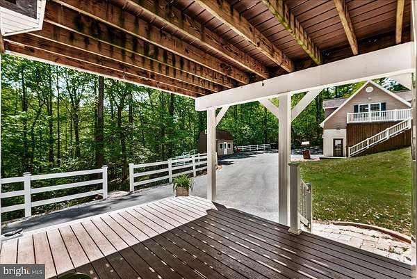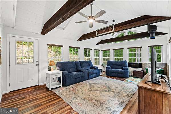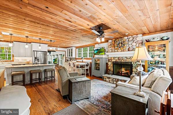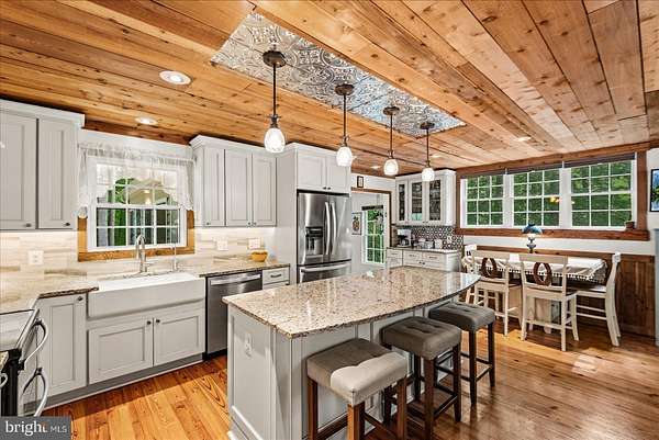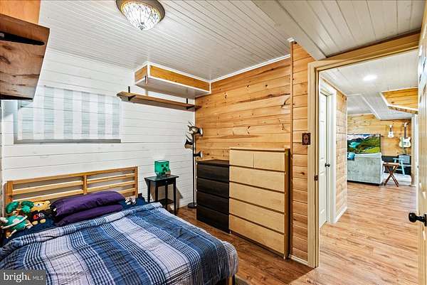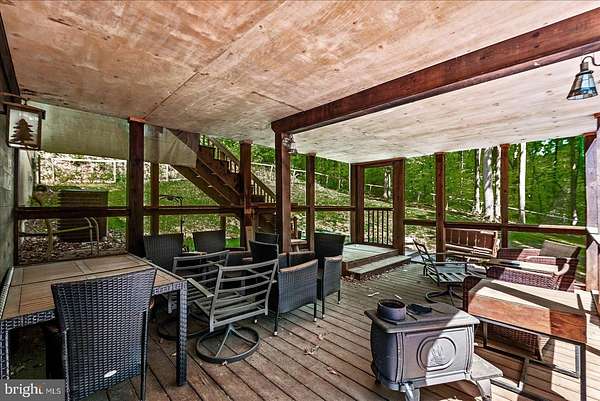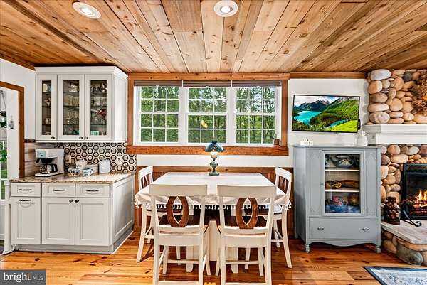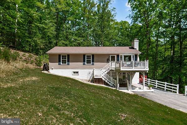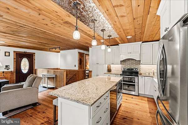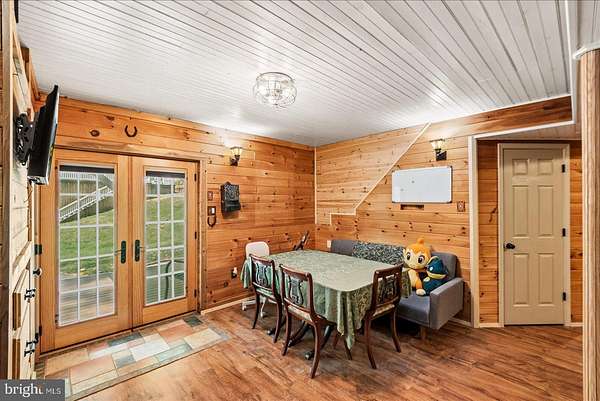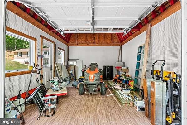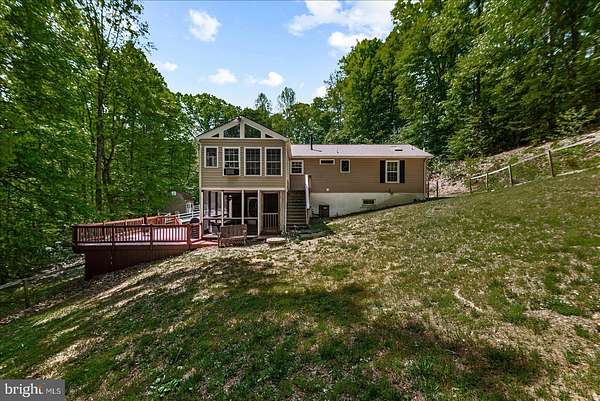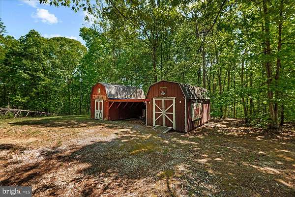 Welcome to your private wooded oasis in Stafford County, conveniently located just minutes from the Leeland VRE and commuter lots. Upon entering, you are greeted by an updated entryway that leads into this Raised Ranch, which combines modern touches with a cabin-like ambiance featuring wood walls, ceilings, and Carolina heart pine floors throughout. The renovated kitchen, equipped with stainless steel appliances (replaced 2020), granite countertops, and a spacious 7-foot island complete with a built-in wine cooler, also includes a coffee bar. The kitchen, living room, and dining area flow seamlessly together, creating an ideal space for entertaining. A gas fireplace with a stone front adds a welcoming touch for relaxation. Adjacent to the kitchen and dining area is a newly added sunroom, fully insulated and featuring luxury vinyl plank flooring, with a hookup available for a chiminea. Upstairs, you will find three bedrooms, including a primary suite with cedar closets and an ensuite Jack and Jill full bath/half bath, recently renovated in 2020 with granite countertops and a newly added tub/shower combination. Descend to the basement, which houses the laundry area, a fourth bedroom (NTC), a full bathroom, and a sitting area with a wood-burning stove, providing access to both the front and rear of the property. The property also includes a detached three-car garage with temperature control and a workbench that will remain. Above the garage is a 1,000-square-foot apartment; all utilities for the apartment are connected to the main house, with the exception of cable. The water heater and HVAC system were replaced 1.5 years ago, and there is a washer/dryer hookup available. On the property, you will find three storage sheds, with the closest shed to the house, located across from the garage, equipped with electricity. Additional features include a whole-house water filtration system and a gas-powered generator. The roof was replaced in 2020. Front deck on entrance of house was expanded and is trex.