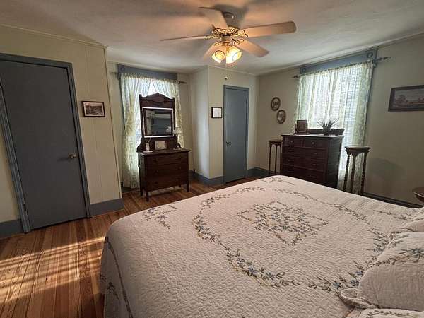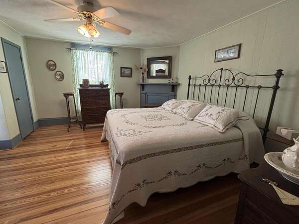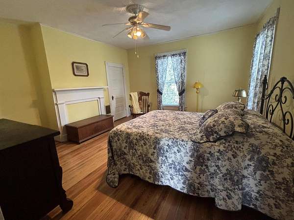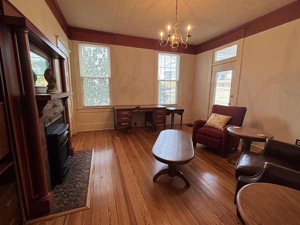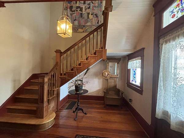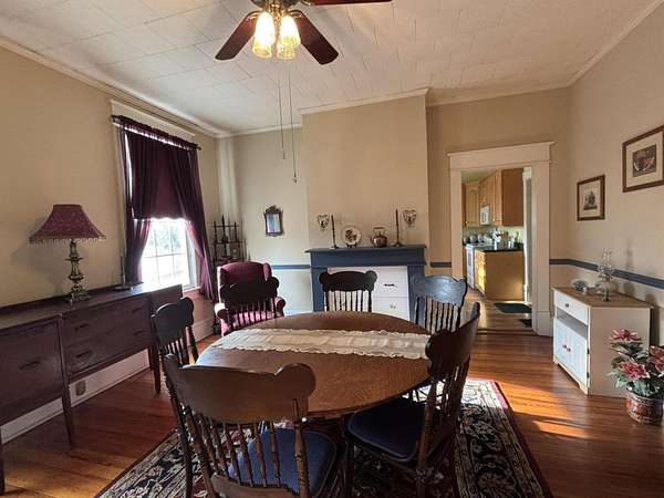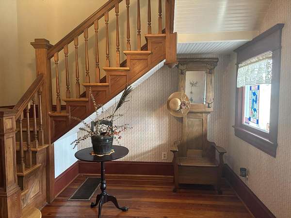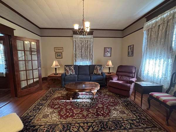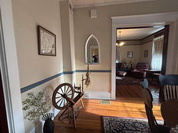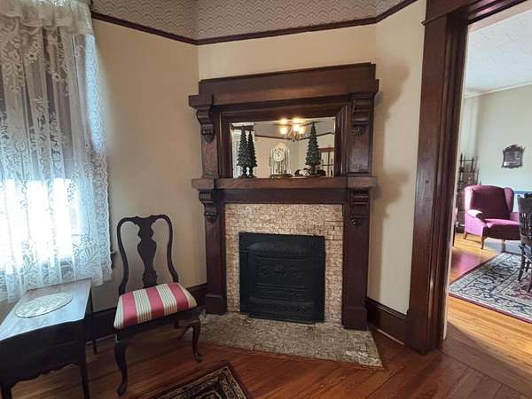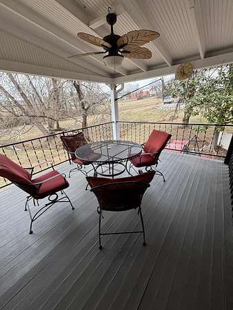Longing for a charming 2-story Victorian home on a large lot with a fountain and a waterfall? The Primary bedroom is entry level, if you choose. Newer shutters, fretwork and siding! A wrap-around porch for quiet evening chats. There is also a private dining deck. Deck ceilings have PVC beadboard for maintenance free summers. The 2018 Roof has a delightful decorative lightening rod on top, A Heat pump w/ gas backup was installed in 2021. Quiet tilt-in thermal windows, 2 fireplaces and decorative mantels are seen throughout the home. Save time for swinging on the lower deck this spring. Public water and sewer. Appliances stay. Lots of storage in the store room below the deck and in the walkout partial basement. This home reminds you of the St. Louis World's Fair homes of the early 1900s!