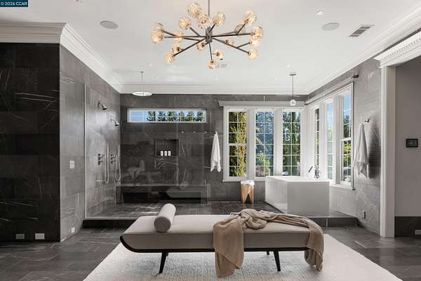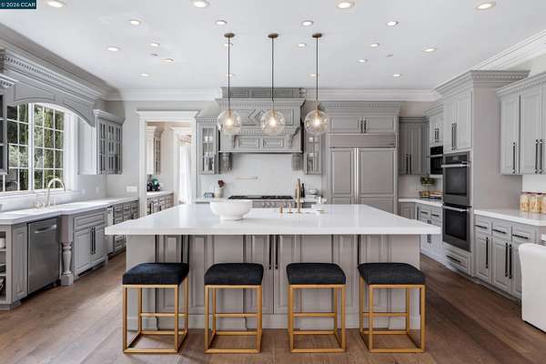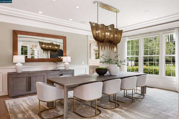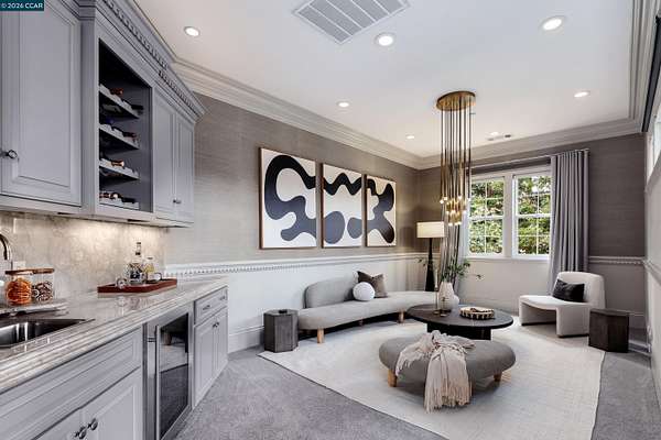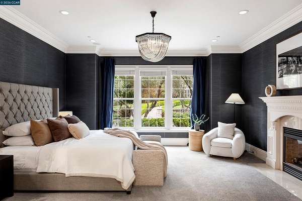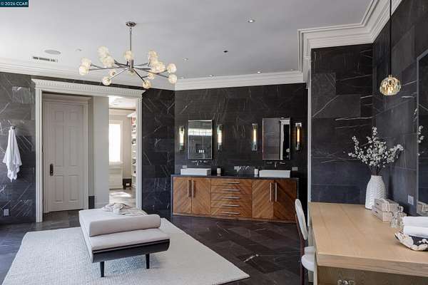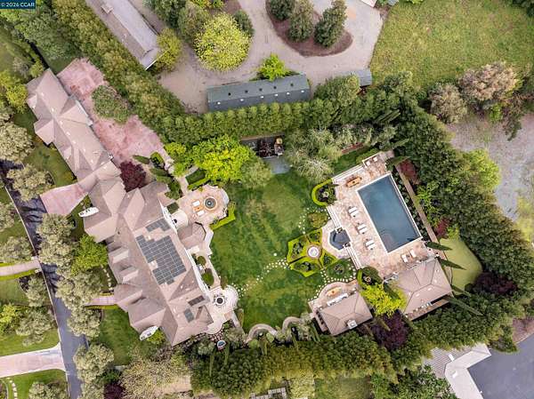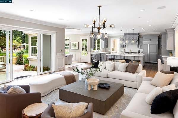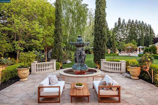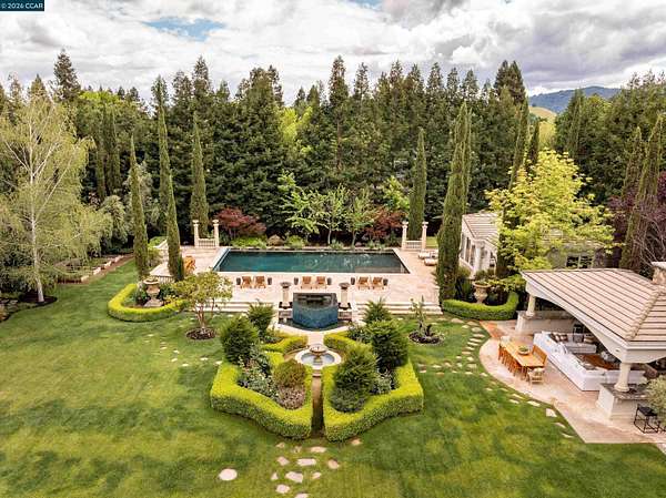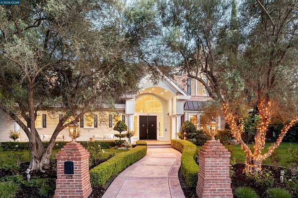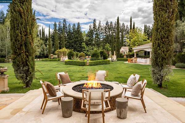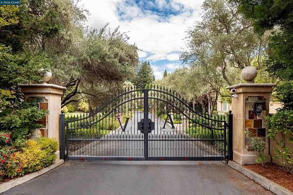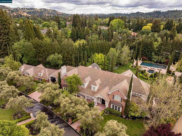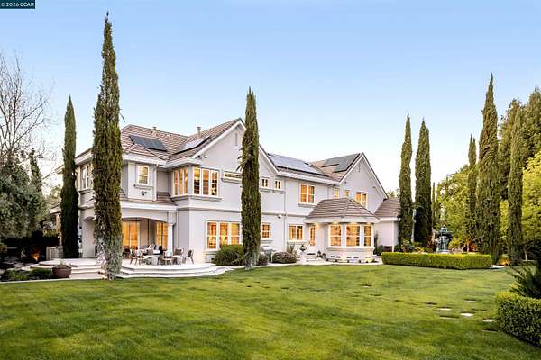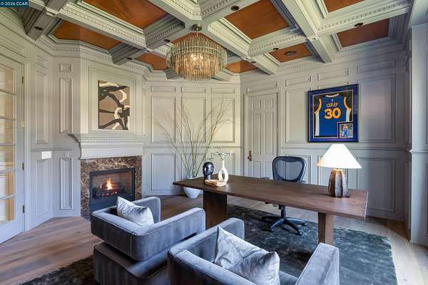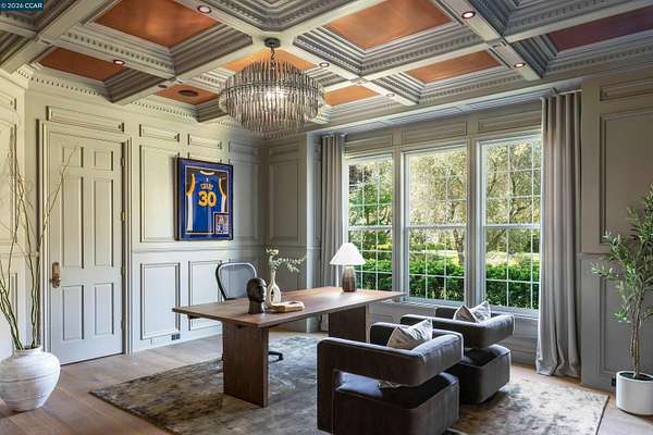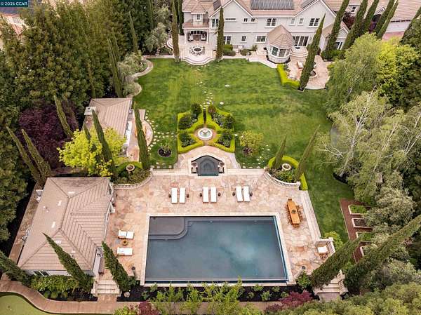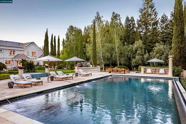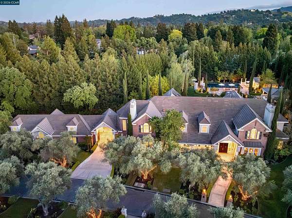 Warriors' superstar Steph Curry made this estate his home; now it can be yours. Its heart is the expansive open-concept kitchen and family room. The kitchen offers elite appliances, quartzite countertops, a butler's pantry, an island with seating for 4, and a breakfast nook with garden views seating 6 more. A striking 2-sided fireplace links the living and dining rooms. A spacious office makes work from home a pleasure. Four spacious bedrooms lie upstairs, each with en-suite baths and generous closets, centered around a large media/play room. The principal suite has a fireplace, wet bar, sitting room and 3 immense walk-in closets. The spa-inspired bath features a shower with dual shower heads, a bench, and a stand-alone soaking tub, all within the shower's glass walls. The 5th bedroom, ideal for guests, lies downstairs, assuring privacy. The back yard is roughly a flat acre, with more than 50 redwoods, 30 Italian cypress trees, cherry trees, imported olive trees, fountains, firepit, shaded lounge areas, putting green, playhouse, and stunning entertainment pavilion with fireplace, heaters, fans, and grill. A pool house offers another bedroom, 2 full baths, kitchen, laundry and sauna. The 6-car garage and motor court provide abundant parking.