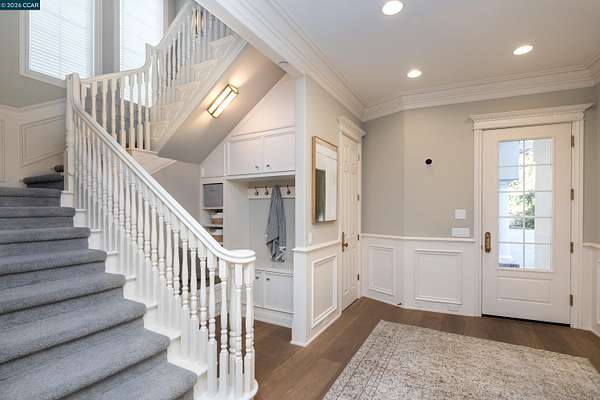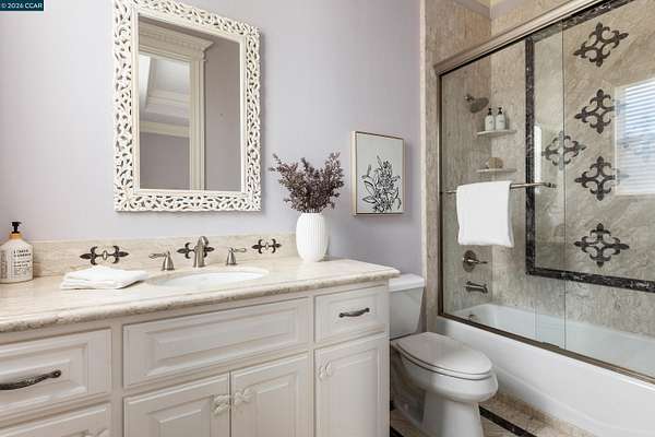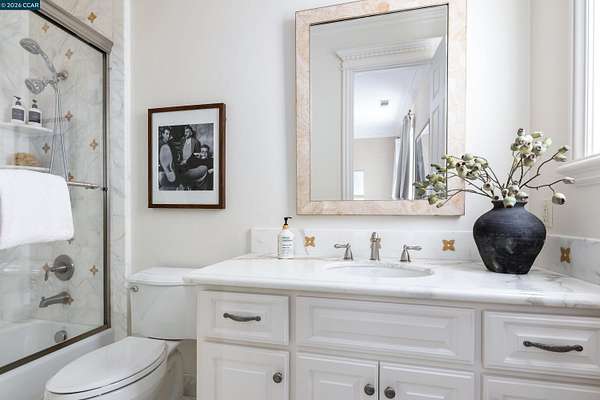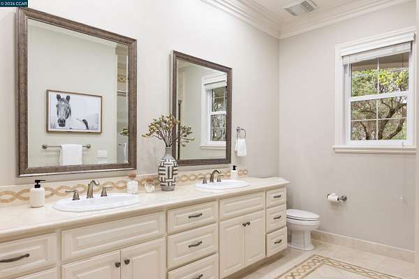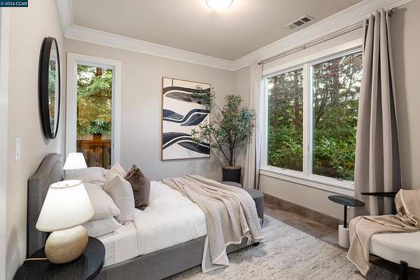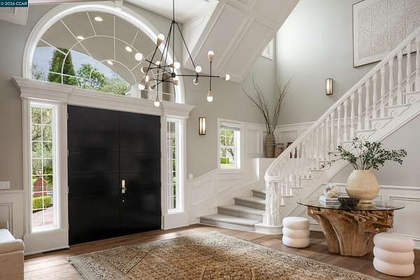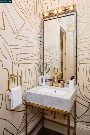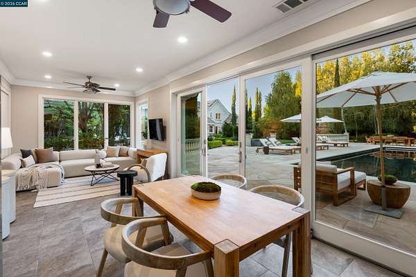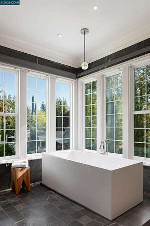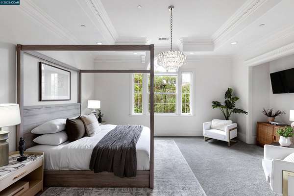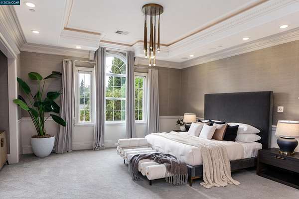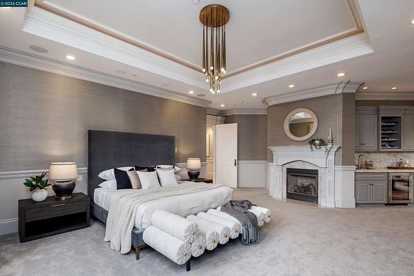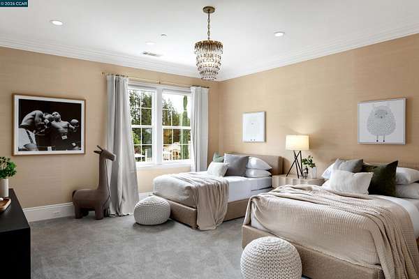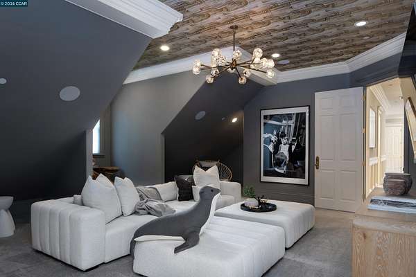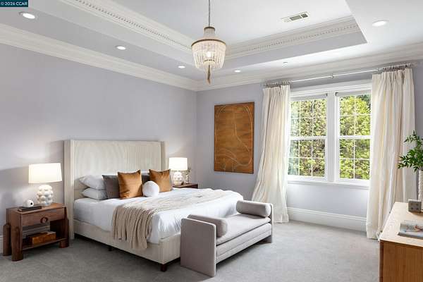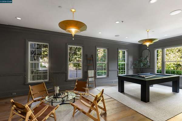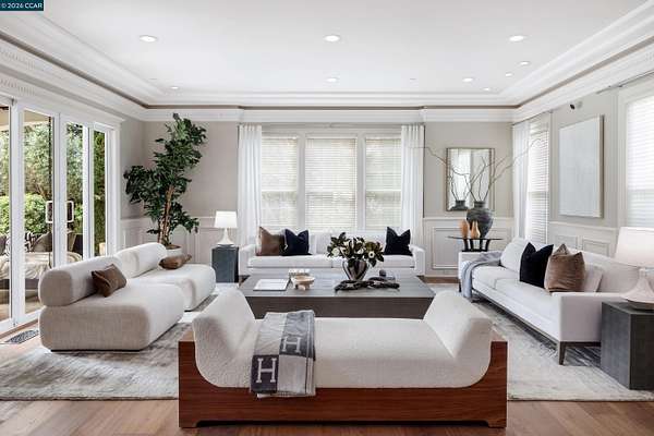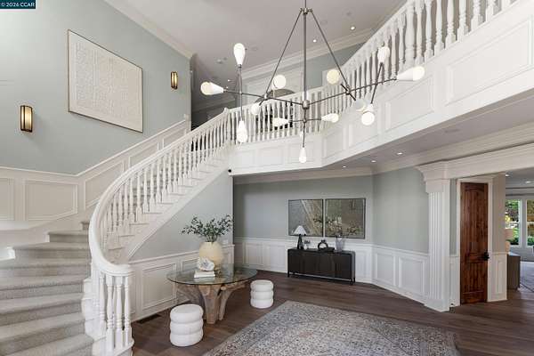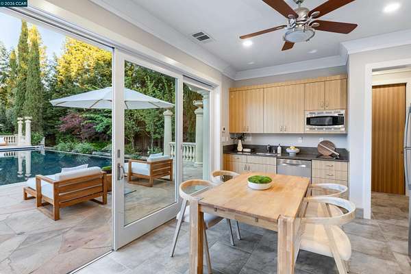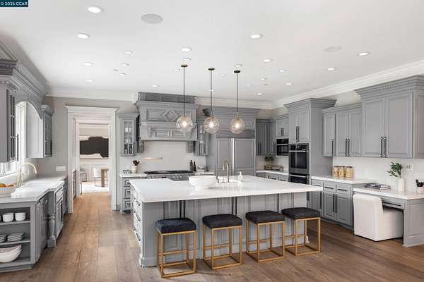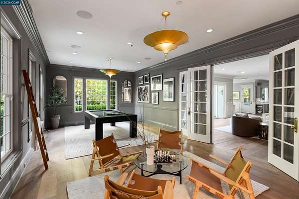 Warriors' superstar Steph Curry made this estate his home; now it can be yours. Its heart is the expansive open-concept kitchen and family room. The kitchen offers elite appliances, quartzite countertops, a butler's pantry, an island with seating for 4, and a breakfast nook with garden views seating 6 more. A striking 2-sided fireplace links the living and dining rooms. A spacious office makes work from home a pleasure. Four spacious bedrooms lie upstairs, each with en-suite baths and generous closets, centered around a large media/play room. The principal suite has a fireplace, wet bar, sitting room and 3 immense walk-in closets. The spa-inspired bath features a shower with dual shower heads, a bench, and a stand-alone soaking tub, all within the shower's glass walls. The 5th bedroom, ideal for guests, lies downstairs, assuring privacy. The back yard is roughly a flat acre, with more than 50 redwoods, 30 Italian cypress trees, cherry trees, imported olive trees, fountains, firepit, shaded lounge areas, putting green, playhouse, and stunning entertainment pavilion with fireplace, heaters, fans, and grill. A pool house offers another bedroom, 2 full baths, kitchen, laundry and sauna. The 6-car garage and motor court provide abundant parking.