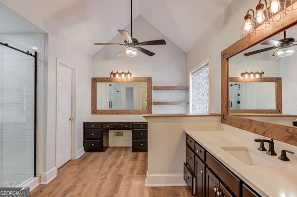 - Bookcases, Double Vanity, Master On Main Level, Separate Shower, Tile Bath, Tray Ceiling(s), Vaulted Ceiling(s), Walk-In Closet(s)