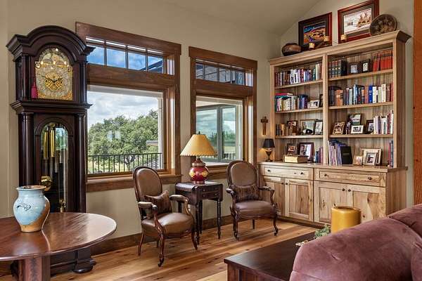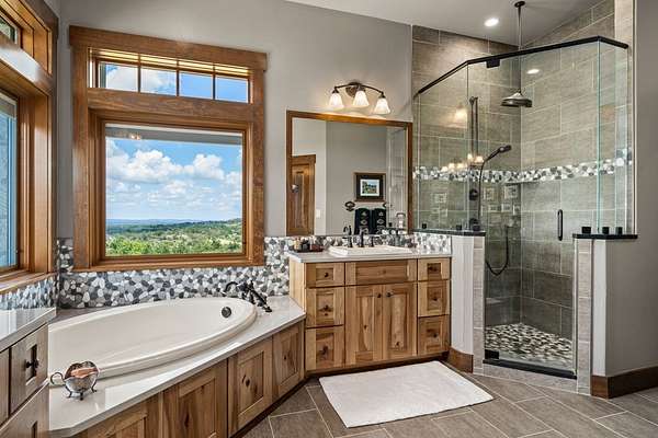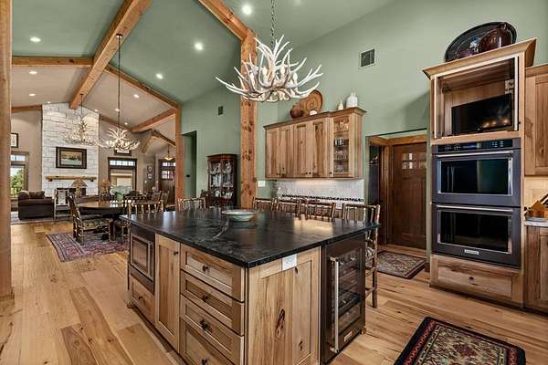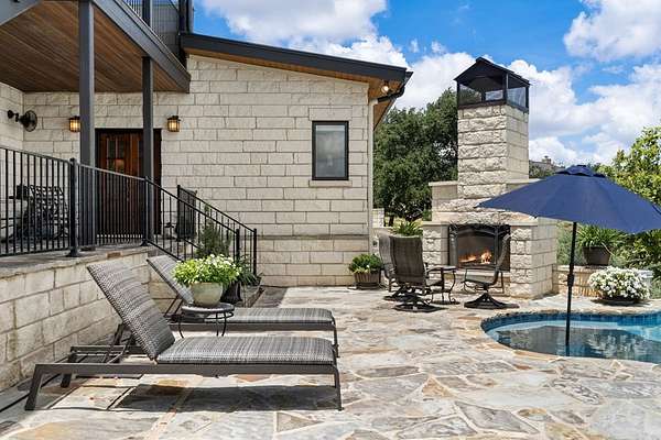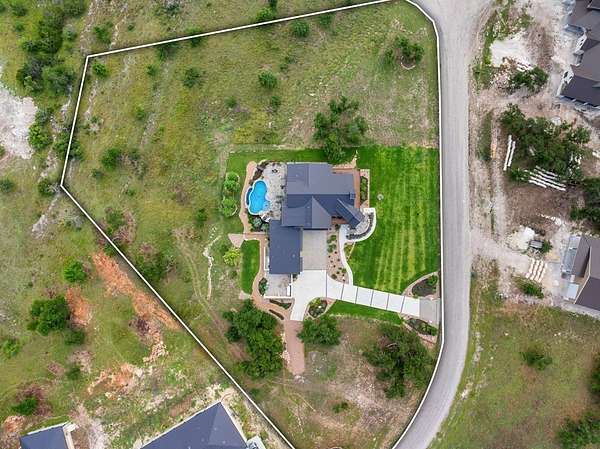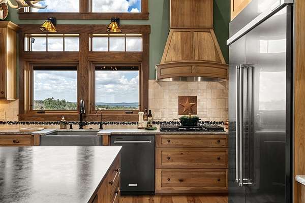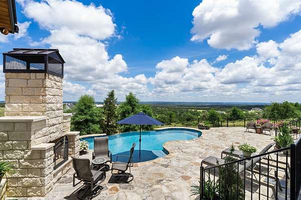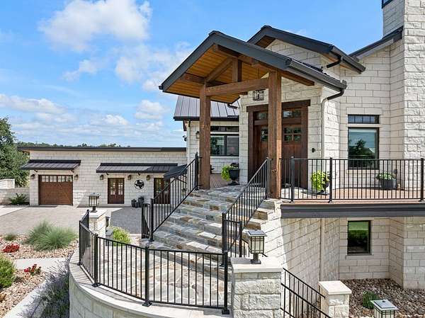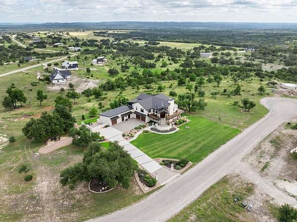 Welcome to 115 Trophy Oak, a 4,778 SF custom estate set on 2.49 acres in The Point Enclave at Vineyard Ridge--a gated community ideally located between Fredericksburg and Johnson City, in the heart of Texas Wine Country. Surrounded by rolling hills and scenic vineyards, this property offers a rare opportunity to enjoy refined Hill Country living with both privacy and convenience. The five-bedroom, five-bathroom residence is thoughtfully designed with high-end finishes and a warm, inviting aesthetic. The main home features maple wood flooring, 18-foot vaulted ceilings with exposed pine and fir beams, and a striking limestone fireplace that anchors the spacious great room. The gourmet kitchen is both functional and elegant, featuring a leathered granite island, custom cherrywood cabinetry, soapstone countertops, black stainless KitchenAid appliances, a 5-burner gas stove, and a wine fridge--making it ideal for both entertaining and daily living. A detached casita provides added versatility with its own living room, kitchen, bedroom, and private garage, perfect for guests or multi-generational living. Outdoor amenities include a Blue Haven beach-entry pool, Trex decking, a flagstone patio, and multiple lounge areas set among native landscaping--ideal for taking in the serenity of the Hill Country. Located just minutes from Fredericksburg's celebrated restaurants, tasting rooms, and boutique shops, this home delivers the best of the region's lifestyle in a secure, gated setting with a low 1.055% tax rate.