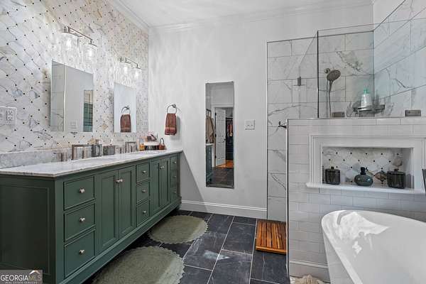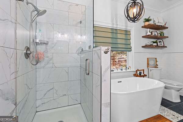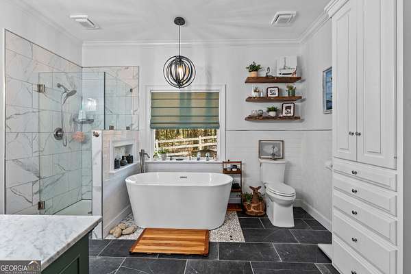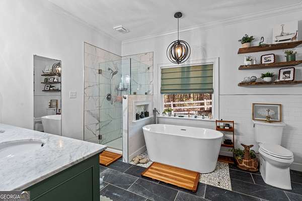 - Bookcases, High Ceilings, In-Law Floorplan, Master On Main Level, Rear Stairs, Separate Shower, Soaking Tub, Split Bedroom Plan, Tile Bath, Tray Ceiling(s), Vaulted Ceiling(s), Walk-In Closet(s)